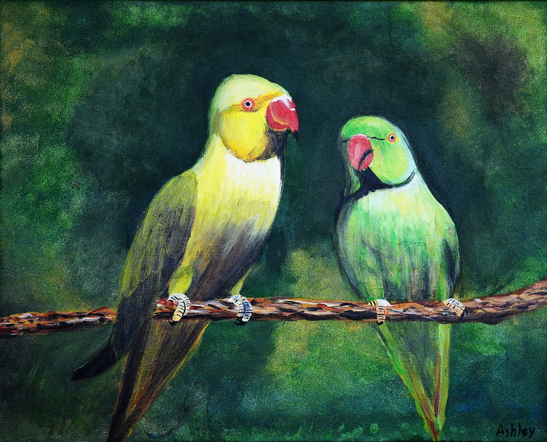 This painting brings two Indian Ringneck parrots to life, their vibrant colours reflecting playful elegance. Inspired by the artist’s mother’s fondness for these birds, the piece offers a subtle alternative to the idea of adding more birds to their home, already alive with the lively chatter of a lovebird. Through this work, the artist celebrates the natural beauty and charm of the parrots, blending personal sentiment with nature. A fun fact: Male Indian Ringneck parrots develop a distinctive ring around their necks as they mature, a feature that sets them apart from the females, who do not develop this ring.