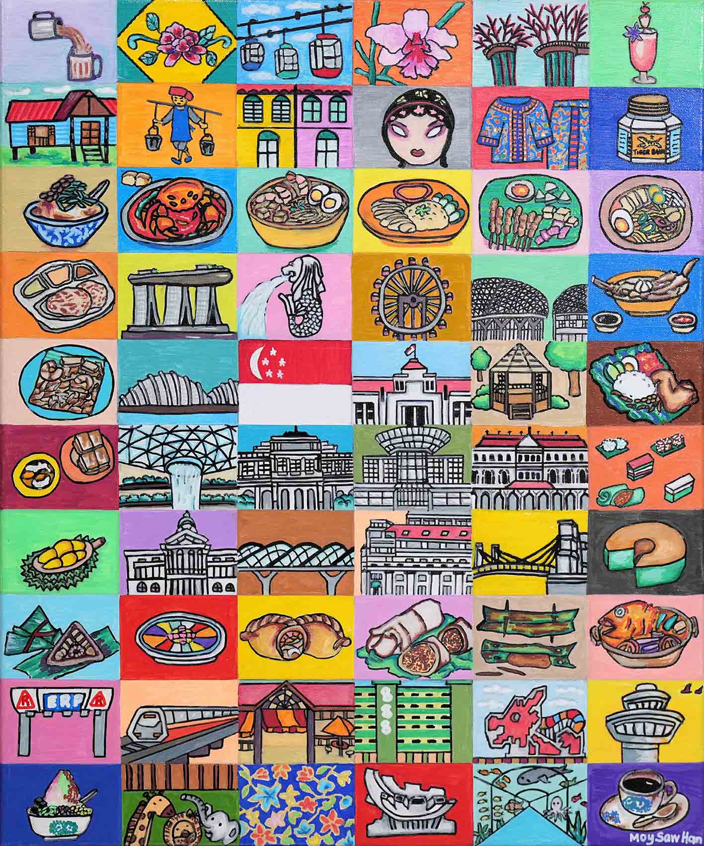 This painting features sixty intricate depictions that collectively celebrate Singapore’s rich culture, iconic landmarks, historical heritage, diverse cuisine, modes of transport, and the vibrancy of everyday life.