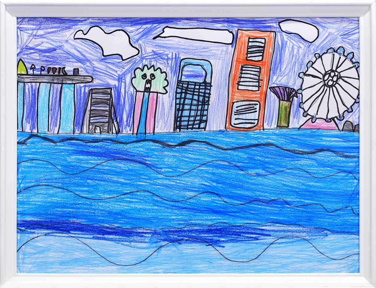 Arish’s use of bold lines and shapes showcases his remarkable ability to translate real-world forms into an engaging visual experience. The vibrant colours infuse the piece with energy, with blue creating depth in the water and sky, while warm tones highlight the key landmarks. This artwork draws attention to the dynamic interplay of colour and composition, where simplicity and boldness take centre stage.