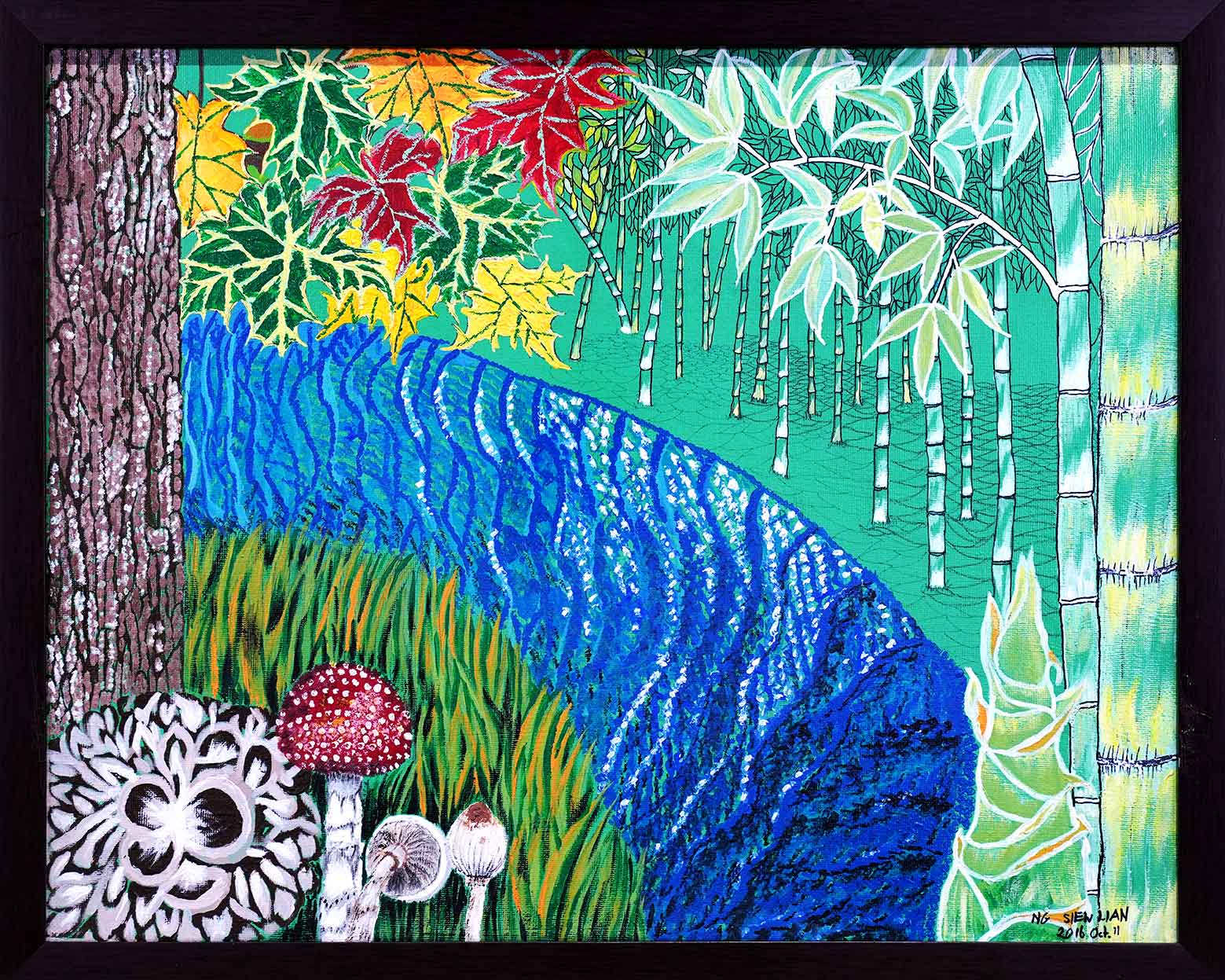 Ng Siew Lian’s "A Walk in Nature" shows a heartfelt reflection of her enduring love for Singapore’s natural landscape. At 56, she paints not only what she sees, but what she longs to experience, rivers winding through quiet greenery, flowers in gentle bloom. These elements are more than scenery; they are symbols of peace and escape, places her heart journeys to when her feet cannot. For Siew Lian, art becomes a path — one that leads her into the stillness of nature, and closer to the quiet beauty she carries within.
