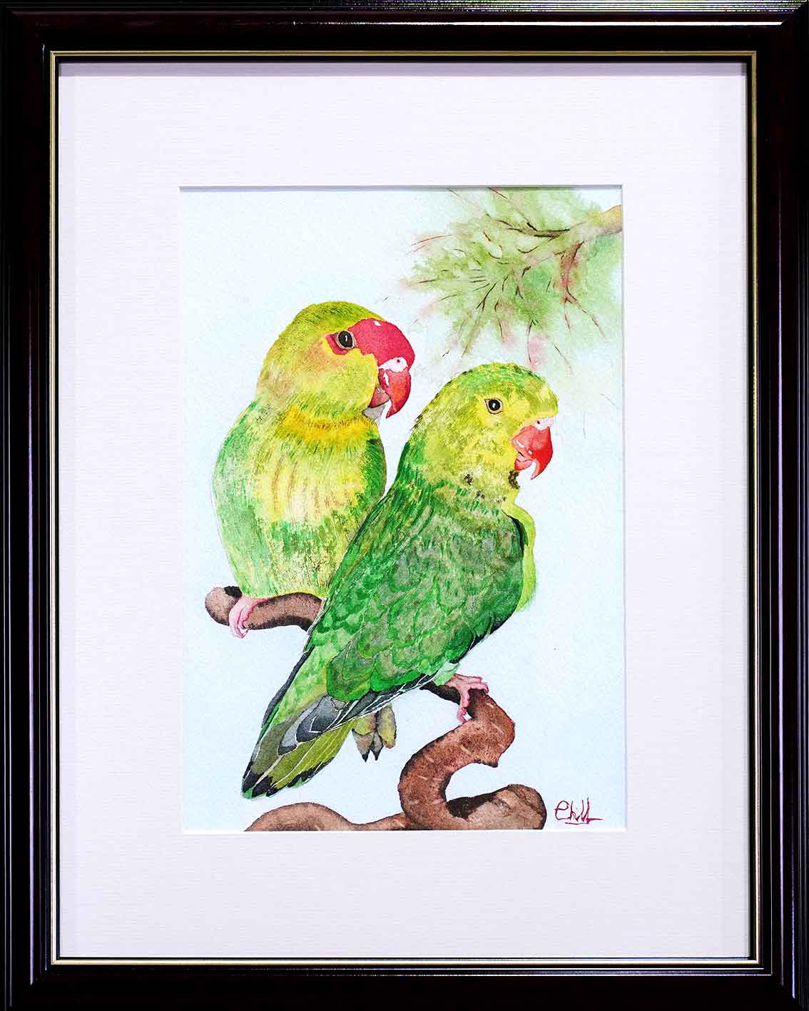Perched together in quiet harmony, this pair of parrots speaks a timeless tale of love and companionship. With feathers that burst with vivid colours and eyes that gleam with lively spirit, this artwork is more than a depiction. It is a celebration of beauty, loyalty, connection, and the vibrant soul of these intelligent, exotic birds who remind us that life is richer in every shared moment.