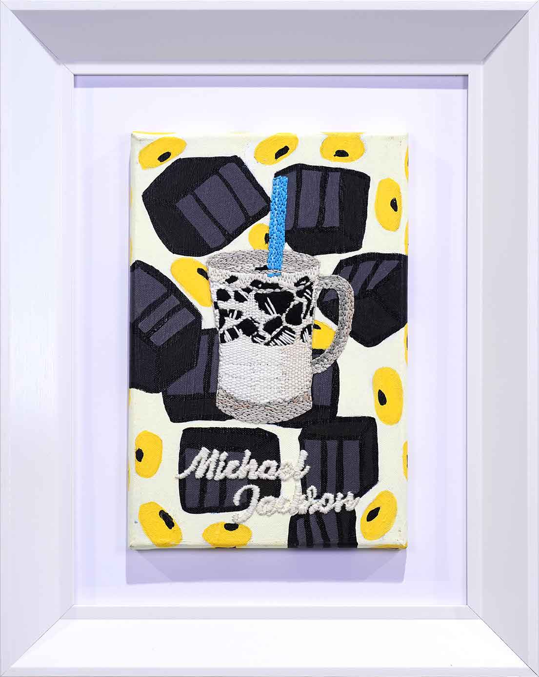 This artwork showcases a playful take on the popular Singapore local drink fondly known as "Michael Jackson" — a mix of chin chow (grass jelly) and soya bean milk. Blending tradition with a lighthearted touch, this piece explores Singapore’s food culture through a combination of visual and tactile art forms.