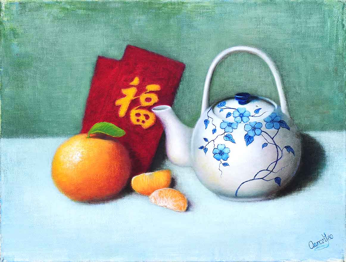 “Blessings” is a visual representation of hopes carried in colour, shape, and symbol, a visual offering of well-wishes and abundance. Each object is placed with care and meaning: the golden oranges represent wealth and vitality, the red envelope signifies the essence of good fortune and prosperity, and the teapot, delicately adorned with blossoms, radiates warmth, welcome, and shared moments. Together, they form more than a still life. They become a gentle prayer, a gathering of tradition and love, inviting us to pause, reflect, and receive life’s blessings with open hands and grateful hearts.
