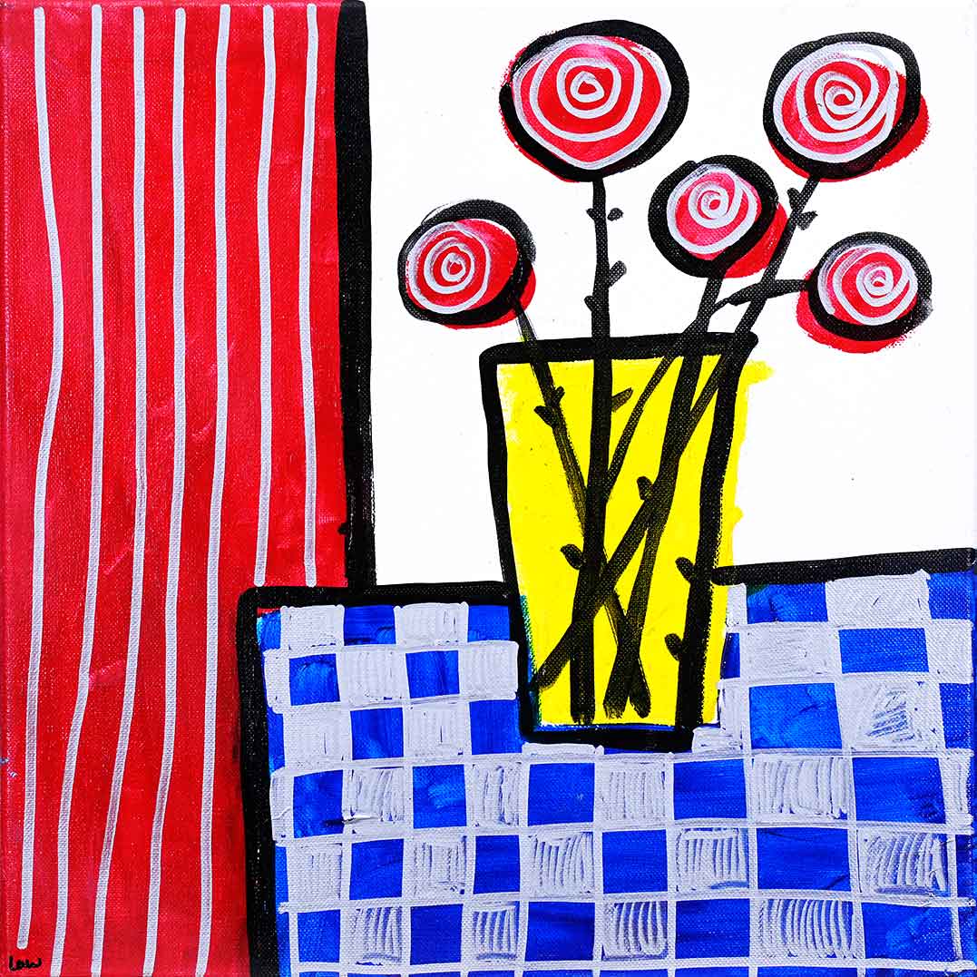 A bold vase of red spiral flowers stands tall amidst a world of patterns — striped red curtains to the left, and a tiled blue-and-grey tabletop below. The artwork bursts with contrast and texture, celebrating everyday beauty through playful geometry, vibrant colour, and a childlike sense of joy and imagination.