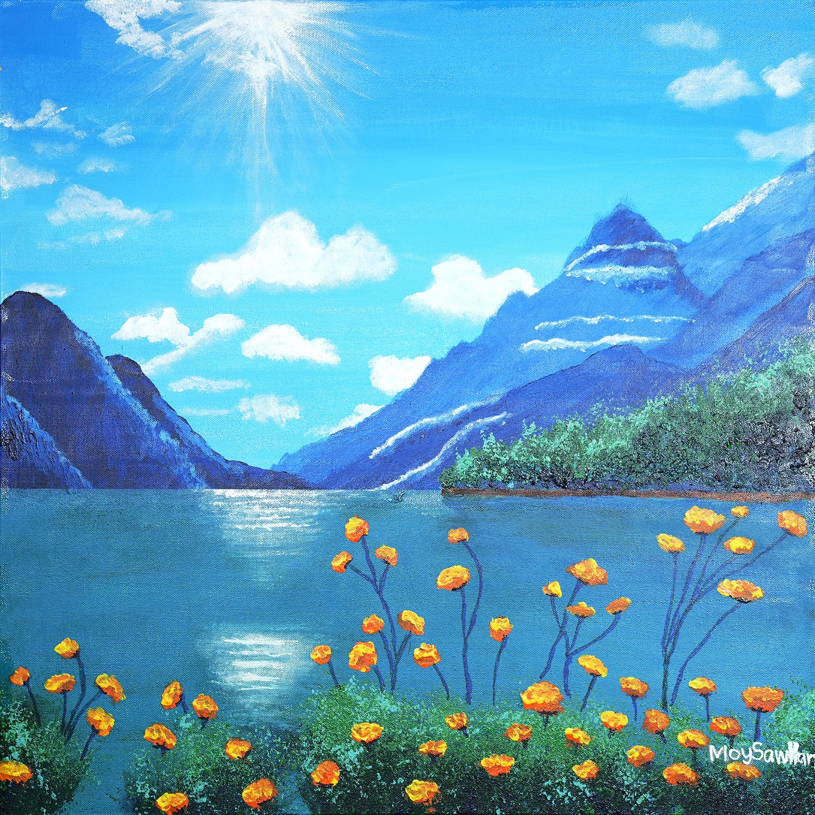 In this acrylic painting, the artist captures the serene beauty of a mountainous landscape, where the bright sun beams down gracefully on a peaceful lake with its waters reflecting the majestic peaks, creating a sense of tranquility and balance. The flowers bursts into bloom, embracing the sunlight with every petal. Through this depiction of beauty and vitality, the artist seeks to inspire others to find light in their own lives, reminding them that, even in the face of adversity, hope can always bloom.