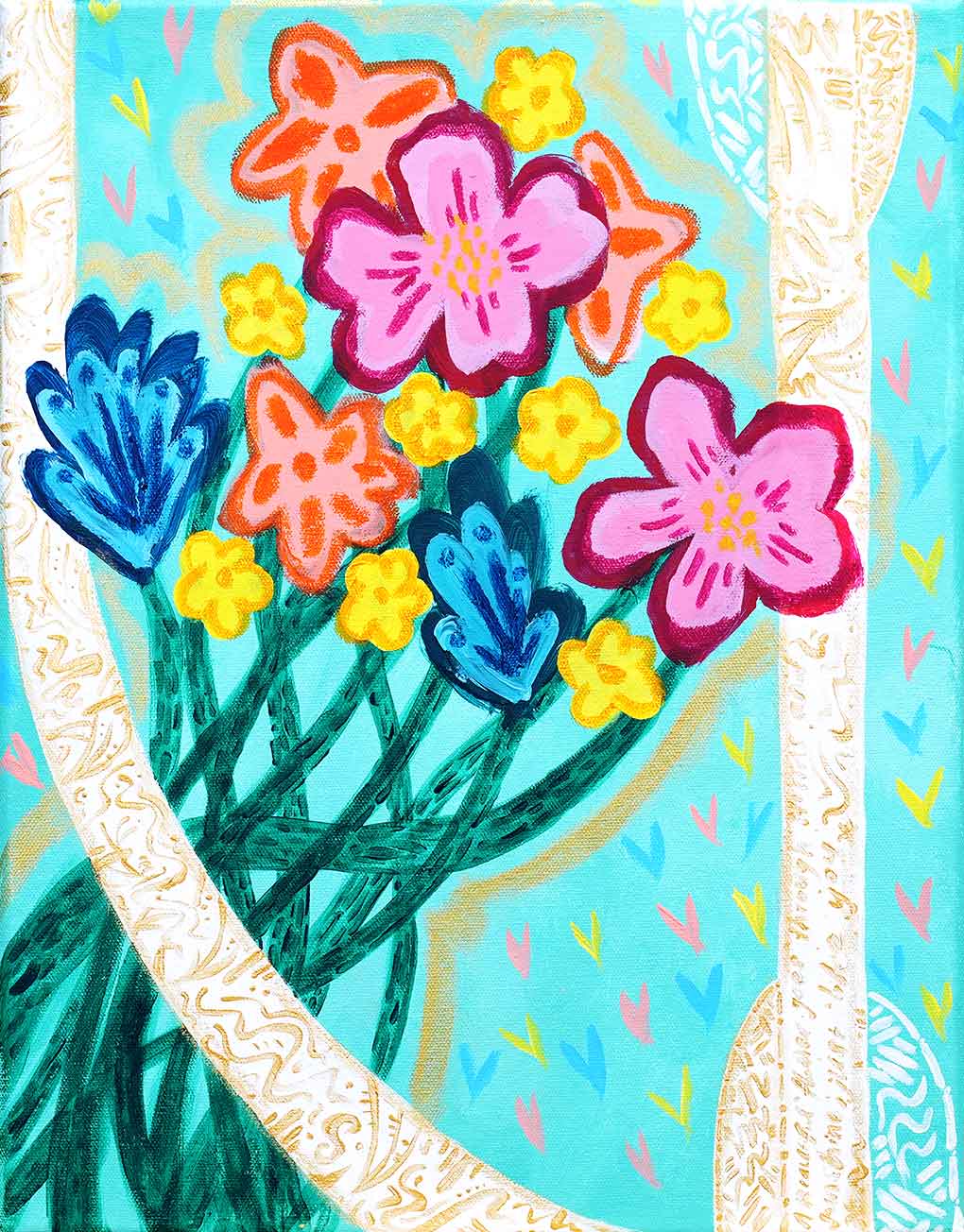 A tender bouquet rests gently, vivid petals in hues of crimson, gold, and lavender radiate warmth and hope. Brilliantly coloured flowers bloom boldly, finding refuge in the quiet comfort of care; sheltered by the guardianship of kind and trustworthy hands, amid the endless cycle of uncertainty the world may bring.