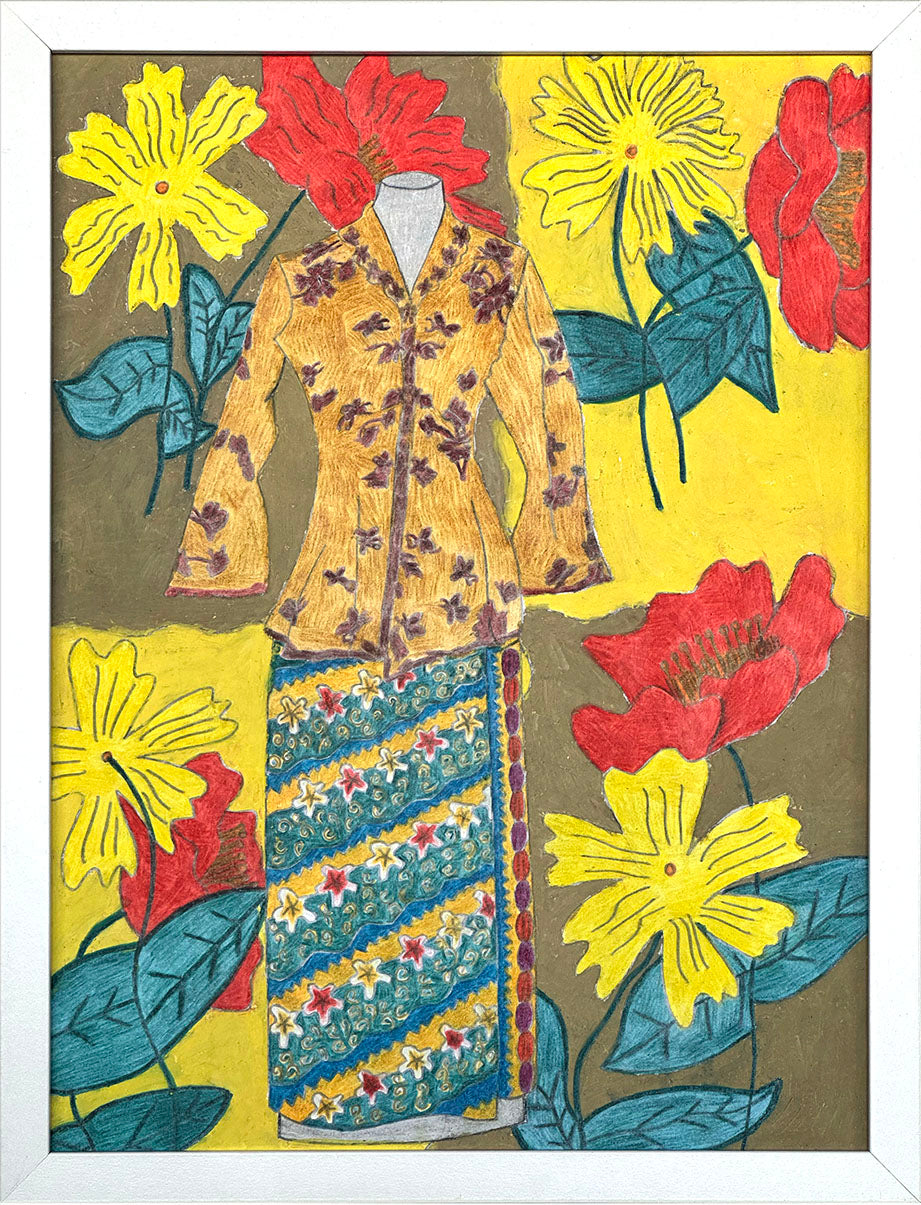 This artwork brings to life the richness of Peranakan cultural heritage and fashion, showcasing the intricate beauty and vibrant colours that define this unique tradition. Through her work, Serene hopes to inspire a deeper appreciation among Singaporeans for the beauty, history, and depth of their shared cultural roots, fostering a greater connection to the rich heritage that has shaped the nation's identity.