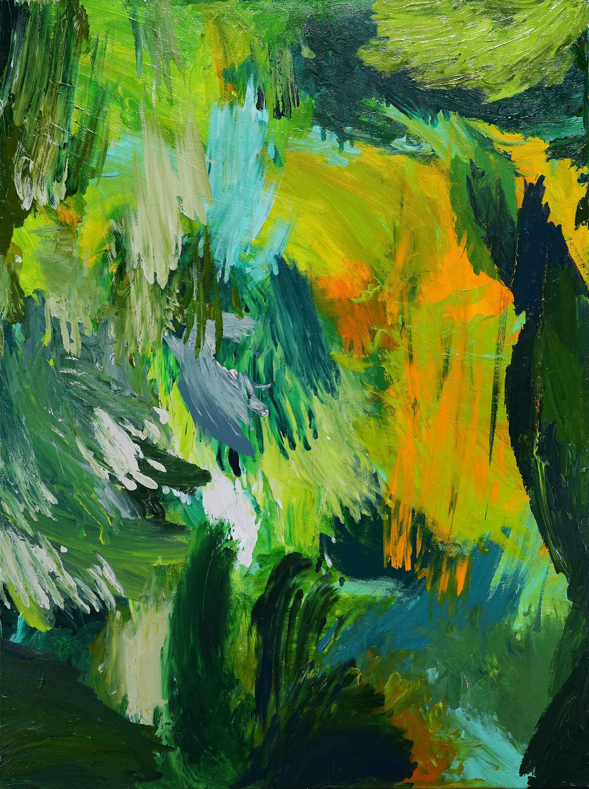 Genine stands before her easel, she begins the piece with a thoughtful layering of greens: deep, earthy tones and vibrant emeralds, crafting a rich, textured foundation that evokes the density of jungle undergrowth. Gradually, she weaves in touches of yellow, infusing the scene with warmth, as though golden sunlight is piercing through the canopy, illuminating patches of life below. As her fingers glide across the canvas in bold, expressive strokes, blending hues in a seamless dance, mirroring the organic ebb and flow of the jungle’s pulse. Each rotation prompts a new direction in brushwork, a new interpretation of form and space. What emerges is a painting alive with motion, an evocation of the jungle’s raw spirit.