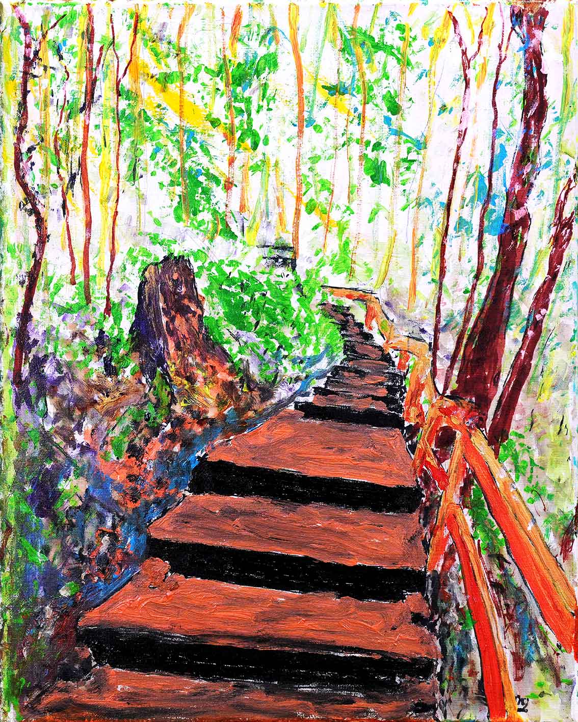 This painting captures the quiet beauty of a stone path ascending through the dense greenery of Bukit Timah, a climb familiar to many Singaporeans. Lush tropical plants line both sides, forming a natural corridor that draws the viewer into the scene. As the steps rise, they seem to merge with the landscape, offering a sense of calm and grounding, an invitation to pause, breathe, and connect with nature.