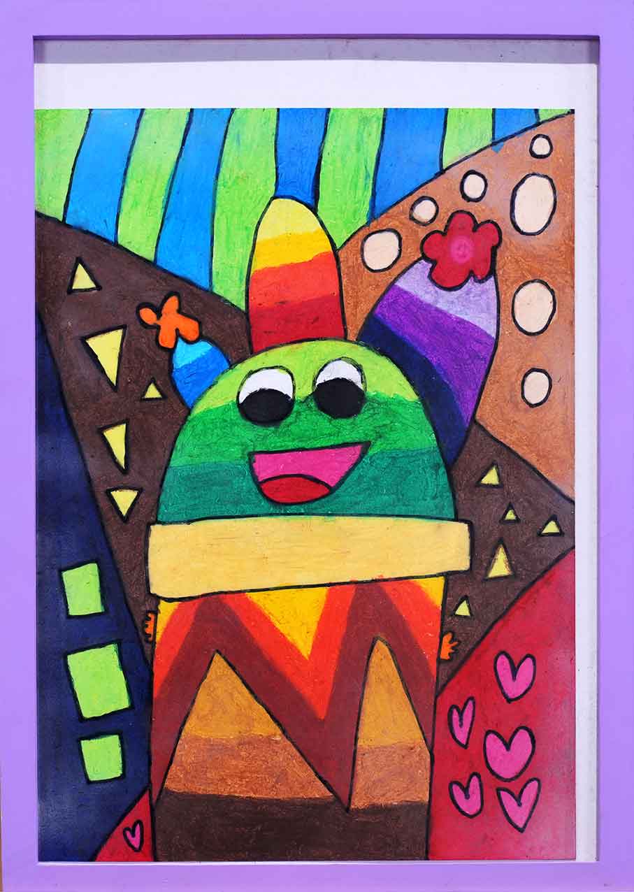 The art piece "Cactus" bursts with colour and character, transforming the humble desert plant into a playful celebration of life. Dynamic use of green, yellow, red, blue, violet, and orange dances across the canvas. The colours of the rainbows are used to reflect Jia Hui's joyful personality. She employs shapes and lively patterns to reimagine the cactus as something far more whimsical — almost animated in its expression. With its joyful energy and carefree charm, Joyful Cactus invites viewers to embrace the unexpected beauty found in even the prickliest of places.