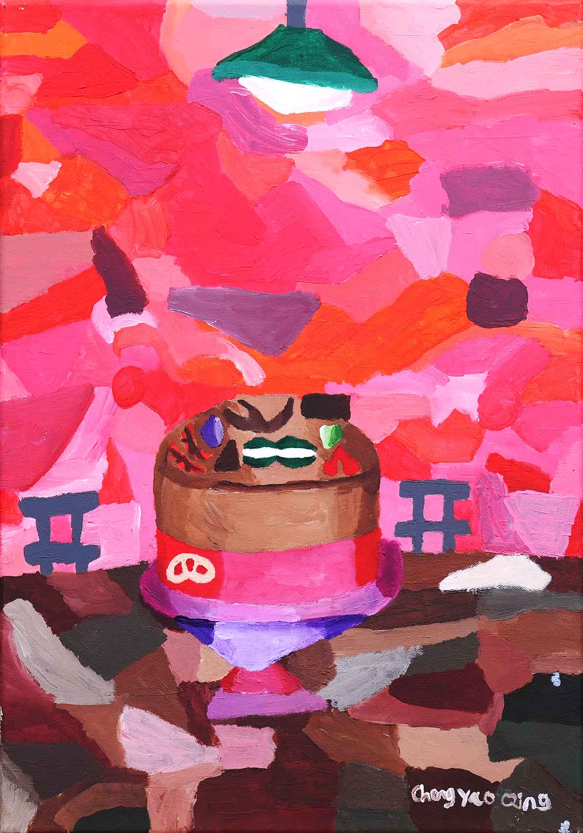 With a desire to entice viewers with a different viewpoint, Chong Yao Qing uses analogous colour palettes, patterns, and textures to present a whimsical twist on the still-life painting. His work reflects his hospitable upbringing. In "Cake-tastic", he captures the sweet, comforting memory of his mother's baking — frequently displayed as a treat by his mother for guests. At the heart of the composition lies not just a treat, but a sweet tribute to family, generosity, and the little moments that create a home.