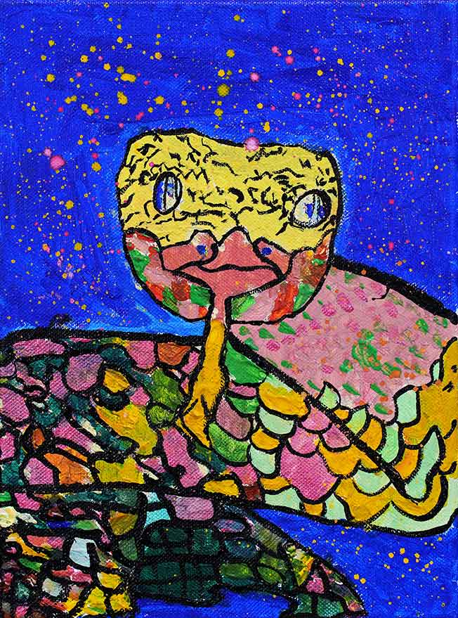 Painted by resident artist Jit Liang, "Celestial’s Serpent" symbolises transformation and growth. Against this subdued blue backdrop, vibrant tones of yellow, pink, and green bring the snake to life, illuminating its form with energy and movement. These colours are more than decorative, reflecting the serpent’s evolving nature. The glowing scales reflect hope against the night sky like a constellation in motion, casting the serpent as both guide and symbol towards change.