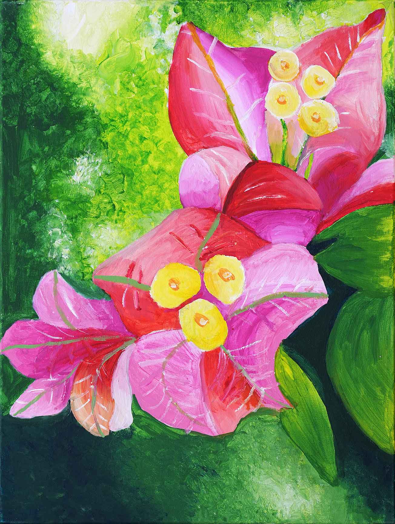 The bougainvillea, often seen adorning overhead bridges in Singapore, embodies the harmony between urban life and nature’s beauty. With delicate shades of pink unfolding against a warm, textured green background, the painting highlights the intricate beauty of the flower, focusing on its vibrant details and the subtle play of colour and light. It’s a celebration of nature’s elegance, even in its smallest forms.