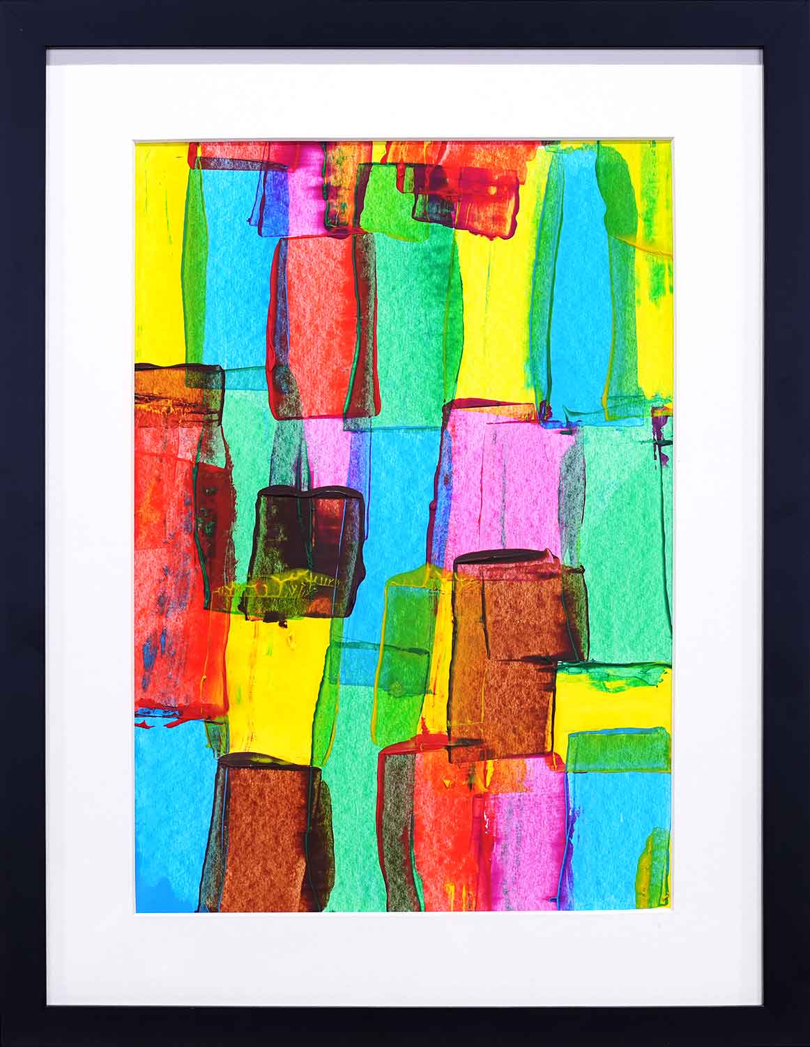 The overlapping colours and layered rectangular forms evoke the impression of buildings and lights reflected on water or glass; vibrant, shifting, and alive with movement. This abstract composition captures the essence of a cityscape seen through a dreamlike lens, where structure dissolves into fluidity, and light dances across surfaces. The dynamic interplay of colours in different tones shows a visual interpretation of city life: bold, ever-changing, and full of layered perspectives.