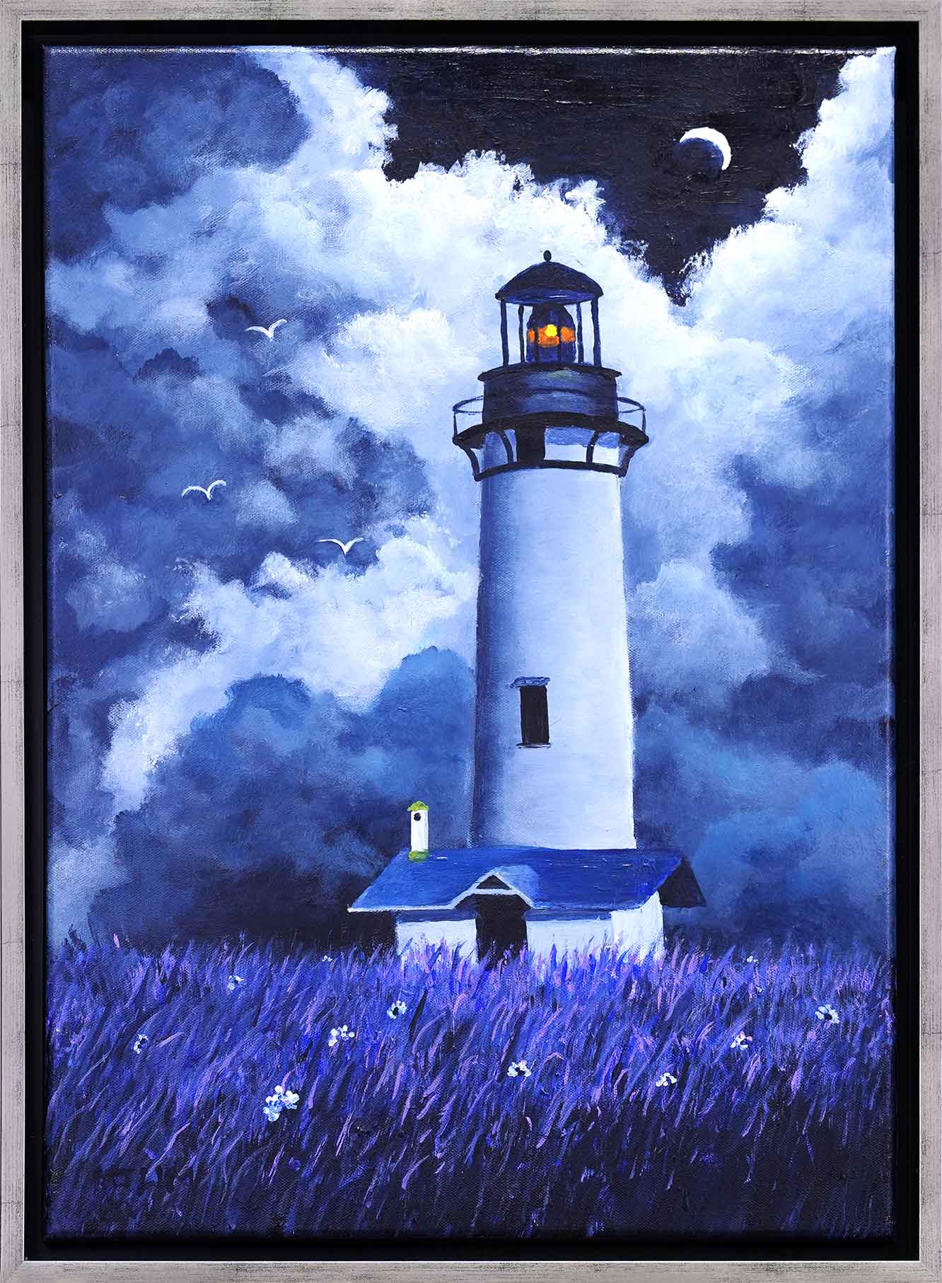 Standing tall against a sky heavy with clouds, the lighthouse glows like a quiet promise in the dark. Its beam cuts through the storm steadily and unwavering like a symbol of guidance in the face of life’s uncertainty. Surrounded by a field of lavender swaying beneath moonlight, the scene speaks of endurance and grace. Birds circle in the distance, the crescent moon watches from above, and still the light holds — a beacon of hope, safety, and strength. This is a portrait of resilience — a reminder that even in the darkest of skies, there is always something to guide us home.