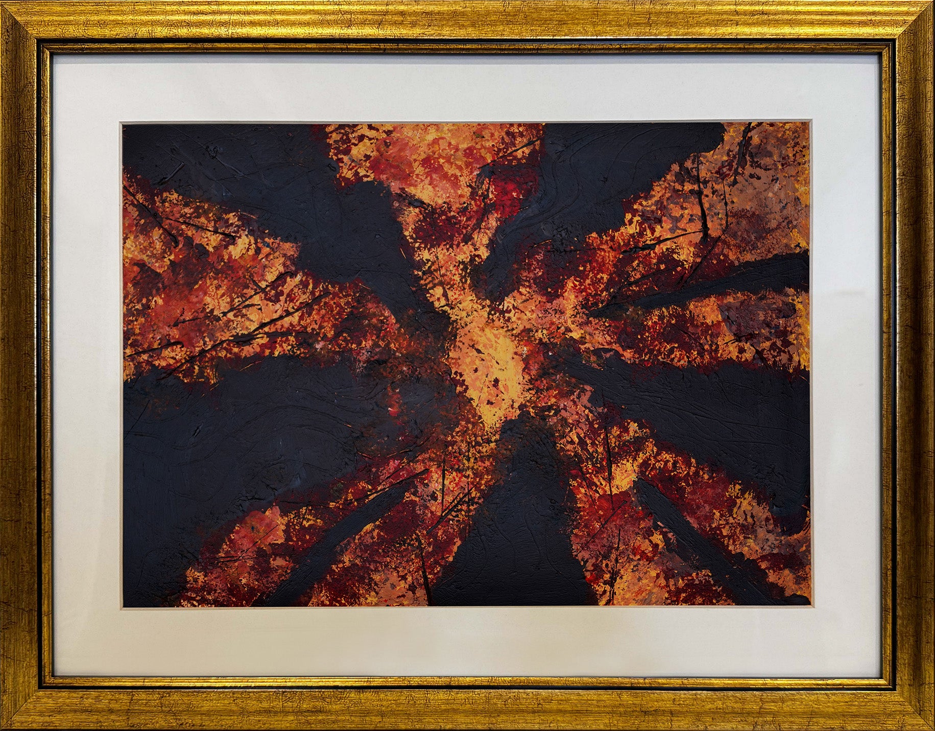 In a dark, atmospheric forest, trees rise from the ground, their trunks textured with rich depth and character. Using a sponge, the artist creates varied textures in the bark, giving each tree a tactile, lifelike presence. The branches stretch upward, creating a sense of quiet movement within the stillness. Deep, earthy tones and muted oranges evoke a subdued beauty, capturing the haunting essence of a forest that feels both alive and timeless.