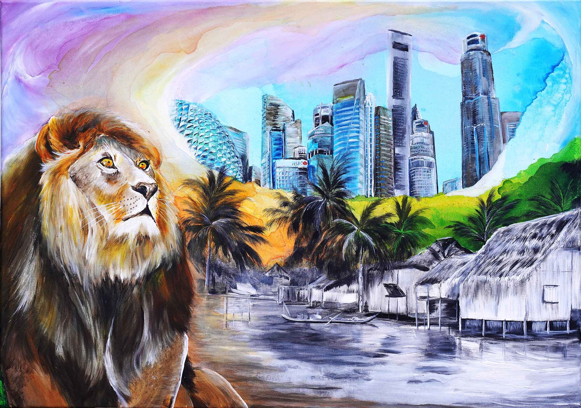 This painting captures Singapore’s remarkable transformation over the past 60 years from a humble fishing village to a thriving global city. The old Jurong area, rendered in sepia tones, represents the nation’s early days, while the modern skyline featuring the Esplanade and financial district reflects the progress and ambition of the present. At the centre of the art piece stands the lion, a powerful symbol of strength and identity, referencing the legend behind the name Singapura — “Lion City”. This piece is both a tribute to Singapore’s origins and a celebration of its bold journey forward.