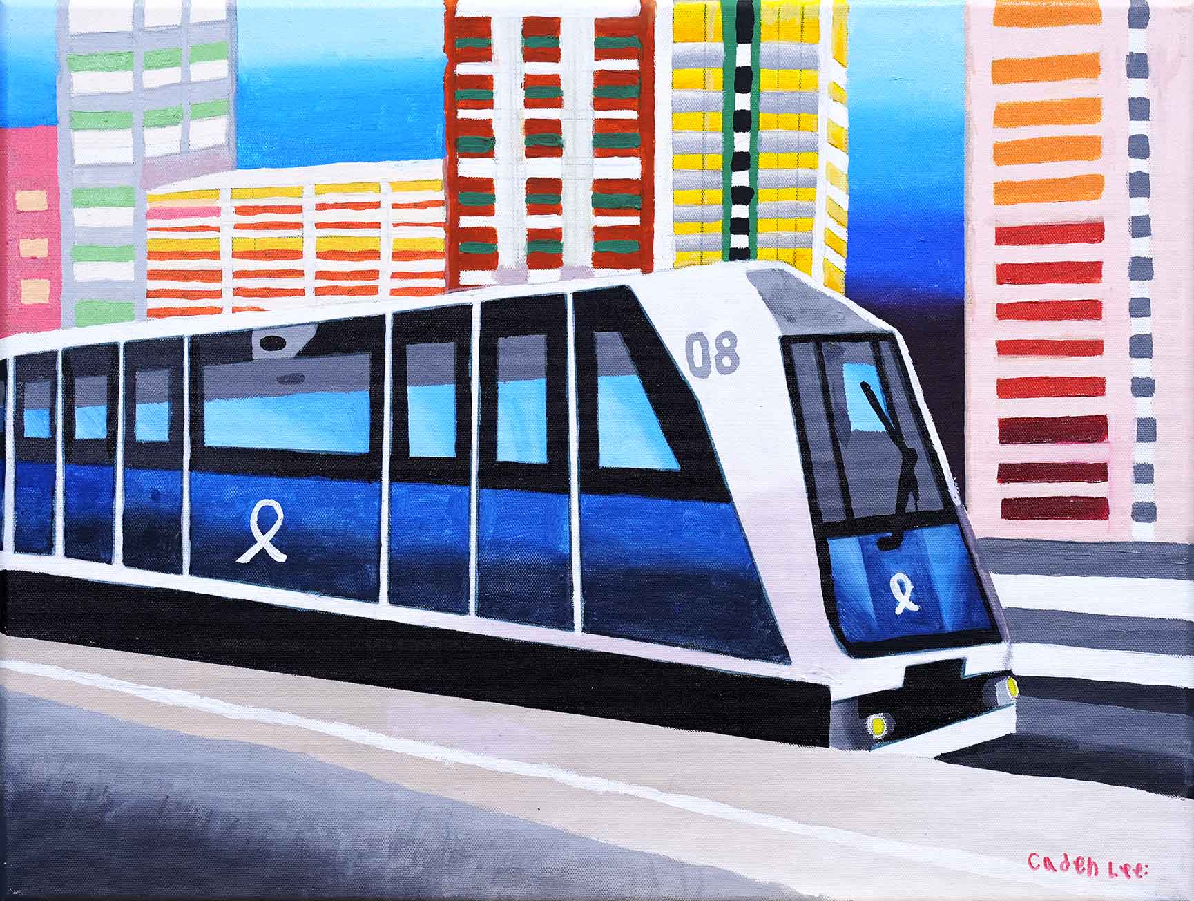 Twenty-year-old Caden Lee living with Autism Spectrum Disorder (ASD) transforms his fascination with urban transport into striking artistic expressions, particularly capturing the MRT system with remarkable precision and skilfully blended details. His creative spirit extends beyond the canvas, finding joy in baking and exploring his surroundings, with a special interest in elevators that adds a unique dimension to his perspective. Homeschooled, he has developed a distinctive artistic voice that celebrates his varied interests, from Disney and Pixar films to his favourite local dish, chicken rice. Through his artwork, Caden brings together his love for colour, mechanical detail, and everyday experiences, creating pieces that reflect his unique way of seeing the world.