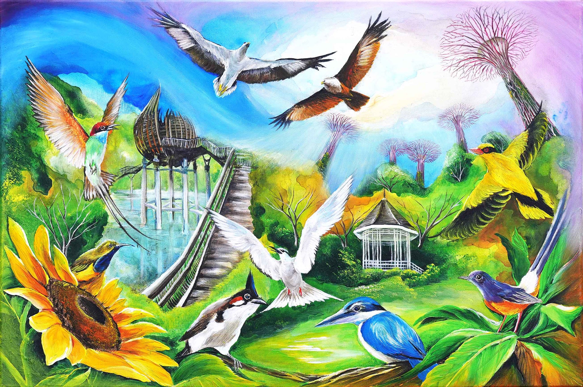 This artwork features the iconic Gardens by the Bay, the UNESCO-listed Botanic Gardens, and the Sungei Buloh Nature Reserve set against a vibrant backdrop, a celebration of Singapore’s harmony between urban development and nature. Surrounding these landmarks are nine bird species featured in Singapore’s second currency series, each symbolising prosperity, resilience, and the nation’s remarkable financial progress over the past six decades. Together, the elements illustrate Singapore’s continued commitment to balancing economic progress with environmental sustainability and the conservation of biodiversity within a thriving city-state.