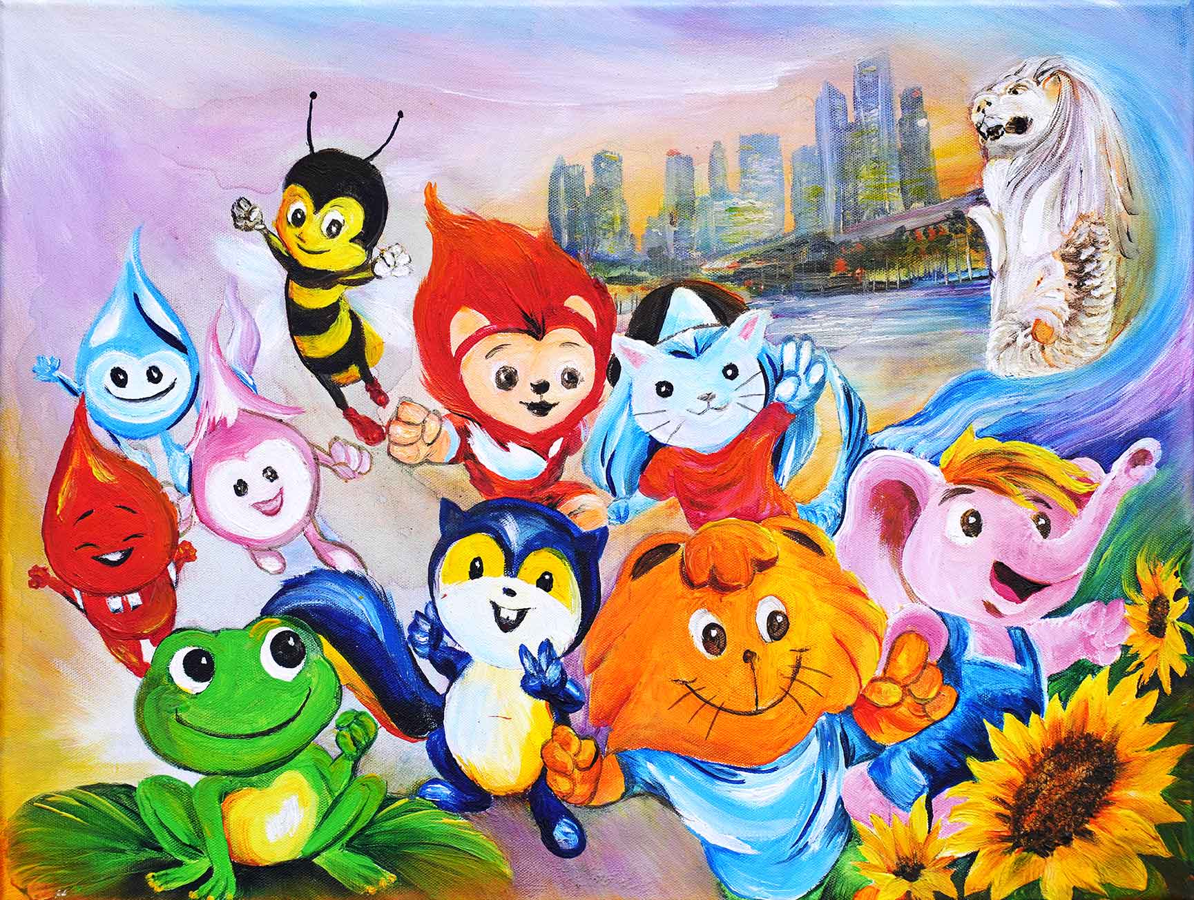 Created in celebration of SG60, this piece brings together beloved Singaporean mascots that have shaped the nation’s social and cultural landscape over the decades. From the 1980s to the 2000s, familiar figures such as Singa the Courtesy Lion, Sharity Elephant, Smiley, Teamy, and Captain Green were joined by newer icons like Nila, August, Merli, Water Wally, and Blood Buddy. Each mascot represents a facet of national life: from community values, productivity, and environmental awareness to water conservation, tourism, public health, and the Singapore spirit. This is a tribute to the campaigns and causes that have united generations.