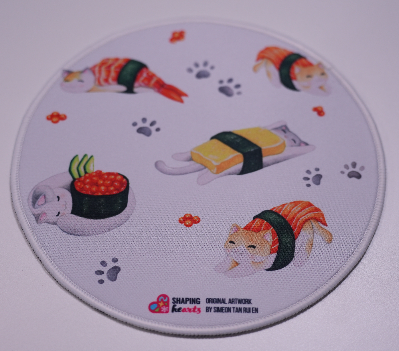 My artwork draws inspiration from one of my personal favourites: Sushi. I too believe cats, much like myself, have a fondness for sushi. Furthermore, it is also possible that there exists a community of individuals who not only appreciate sushi but also share a love for cats. This notion fills me with enthusiasm to depict four felines indulging in their sushi in a variety of positions. Among them, two cats are depicted lounging beneath an ebi and a salmon sushi, another is shown resting beneath a tamago, and the final one is shown in a leisurely pose, enveloping a delectable fish egg roll sushi.