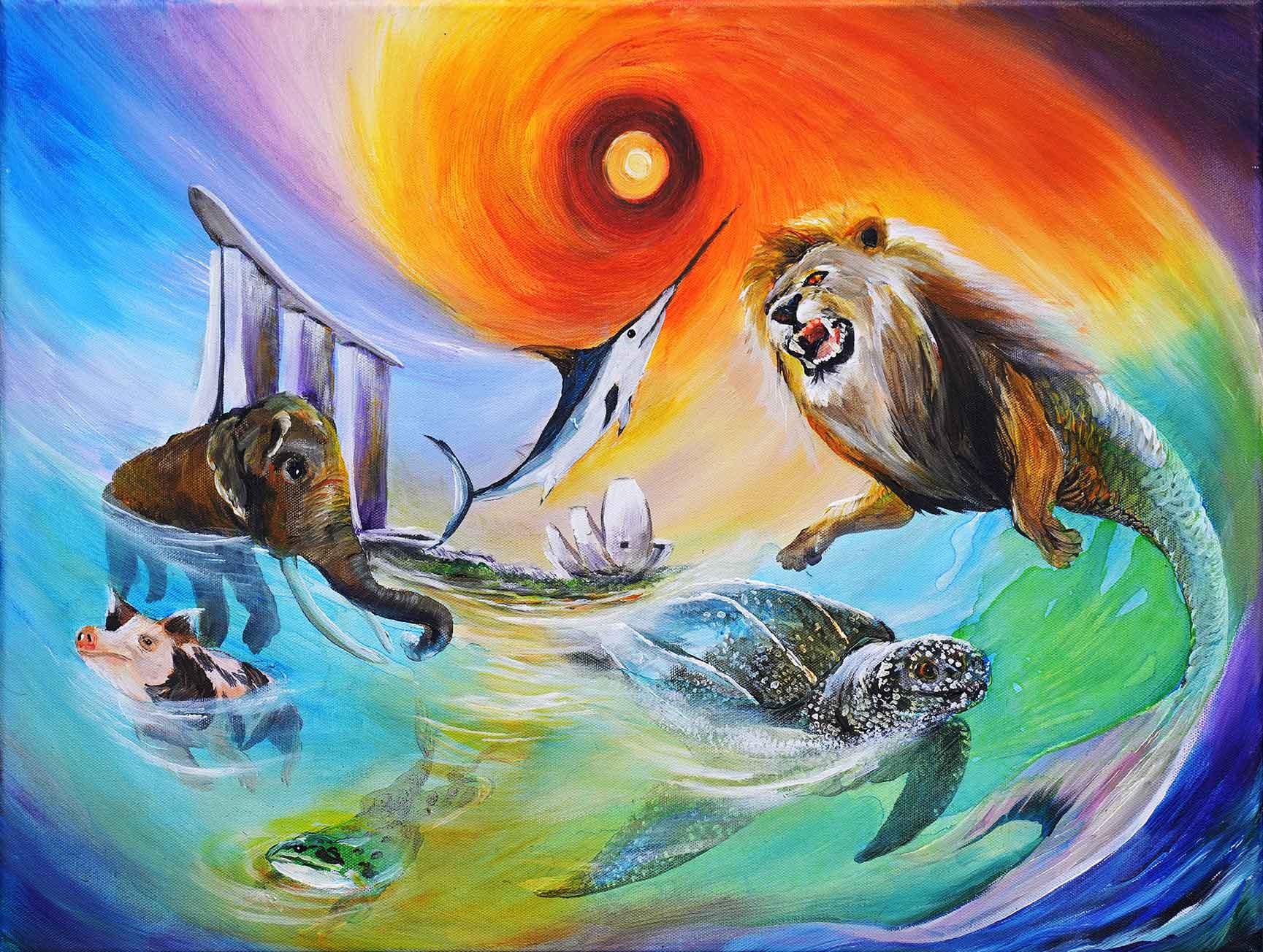 Set against the iconic backdrop of Marina Bay Sands and the ArtScience Museum, the painting brings to life the rich tapestry of Singapore’s legends and myths. Featured are beloved tales such as the Merlion, the sacred origins of Kusu Island and Katong’s Leatherback Turtle, the whimsical story of Pulau Ubin’s formation through the Elephant, Pig, and Frog, and the dramatic swordfish legend of Red Hill (Bukit Merah). Through vibrant imagery and layered symbolism, the artwork pays tribute to the folklore that shaped our cultural imagination — stories that continue to inspire and ground Singapore’s identity today.