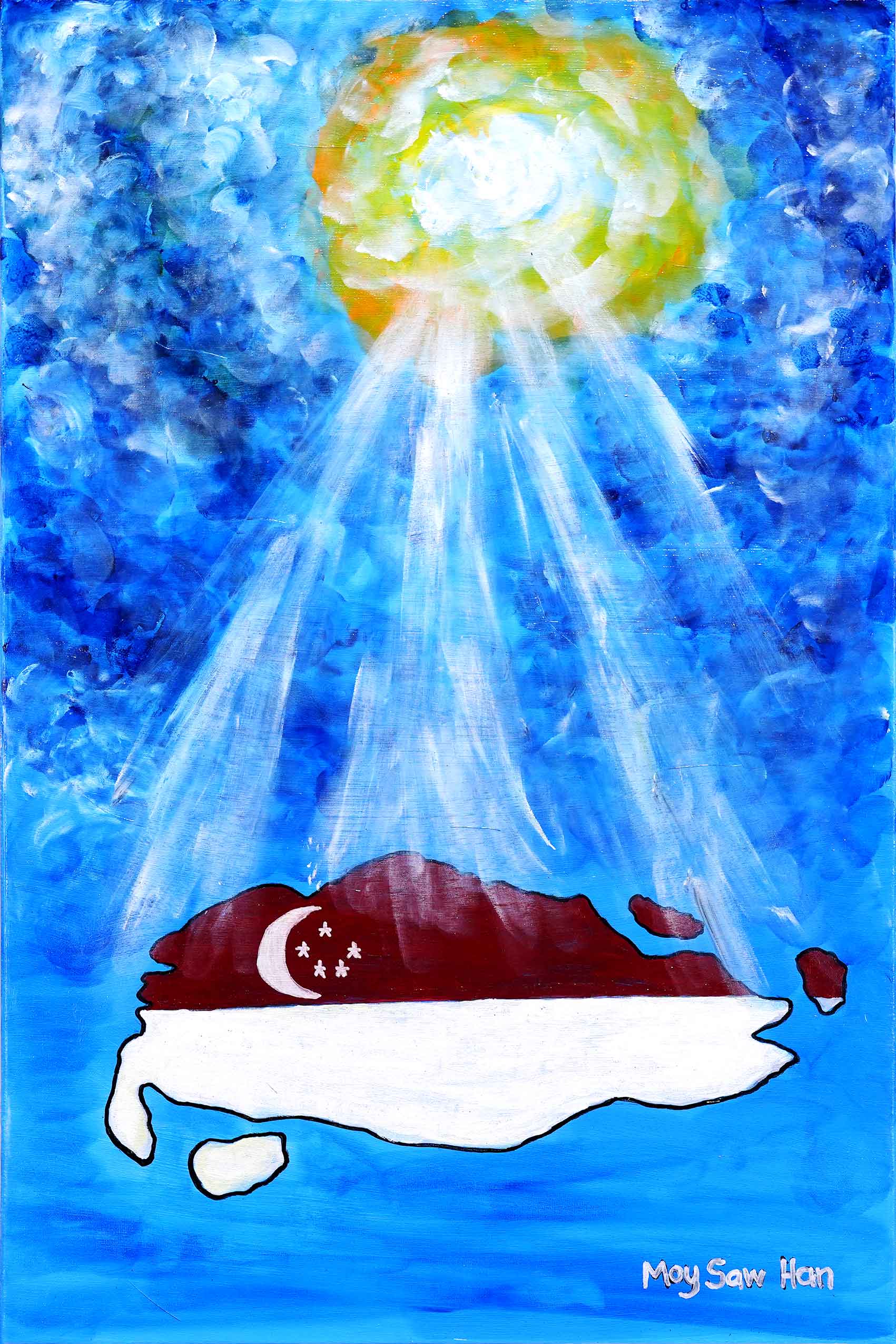 This abstract painting presents a striking vision of an open heaven over Singapore. The island is depicted in Singapore's national flag, and surrounding it, the backdrop unfolds in calming shades of blue, evoking a sense of vastness and peace. The contrast between the golden light and the cool blue background creates a powerful visual harmony, inviting a reflection on Singapore's place in the world.