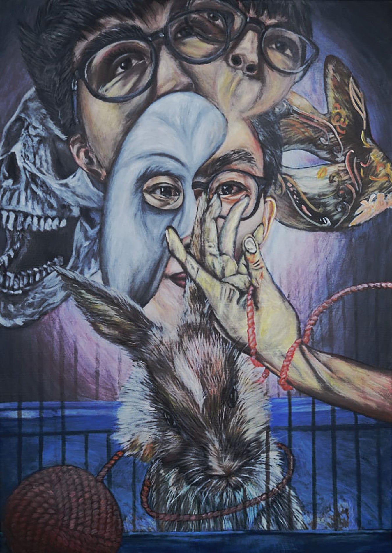 The artist, born in the Year of the Rabbit, uses the metaphor of a rabbit trapped in a cage to express the challenges he faced growing up. Being timid, with low self-confidence and a communication disability, he often felt compelled to conform and live up to the expectations of others in order to fit in. Often, he hid behind a mask, concealing the hurts and frustrations he carried within. Yet, amidst these challenges, the artist holds onto hope — that one day, the cage will be unlocked by a compassionate hand from the community or society, freeing artists like him to pursue their passions and express their true selves.