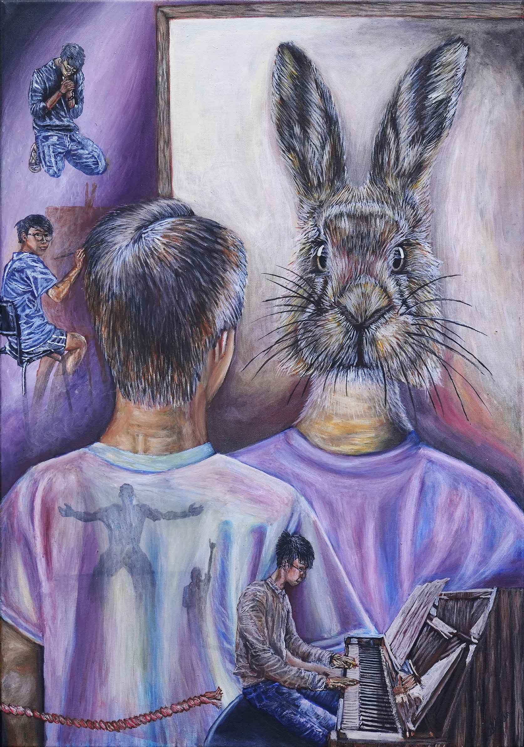 "Out of the Rabbit Cage: Becoming" is the final piece in the artist’s series, symbolising a journey of growth and self-realisation. Like many people with disabilities, the artist continues to face challenges and fears ahead. However, with support from his community, faith, and a willingness to learn, he is learning to navigate the world with newfound confidence, gradually becoming the person he was meant to be. No longer the timid rabbit in a cage, he now embraces his uniqueness and is ready to contribute meaningfully to society. This painting captures the artist’s transformation into someone strong, valued, and full of purpose.