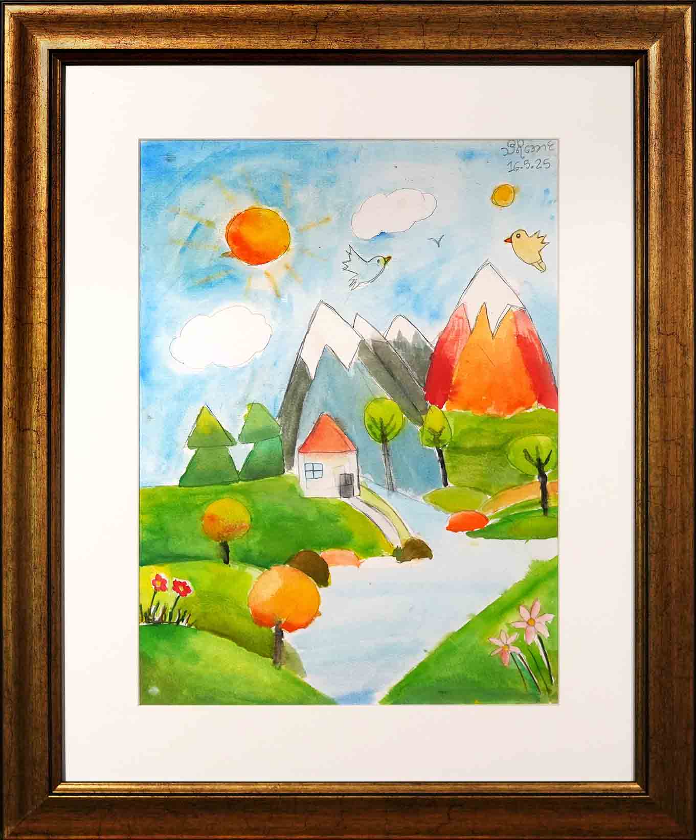 This watercolour painting is a vivid expression of tranquility, created by Ma Thiri Aung. With a love for creating art inspired by the natural world, Ma Thiri uses bright colours to capture the peaceful harmony found in nature. Through her unique perspective, she brings the beauty of the outdoors to life, inviting the viewer to pause and experience the calm and serenity she finds in the natural world around her.