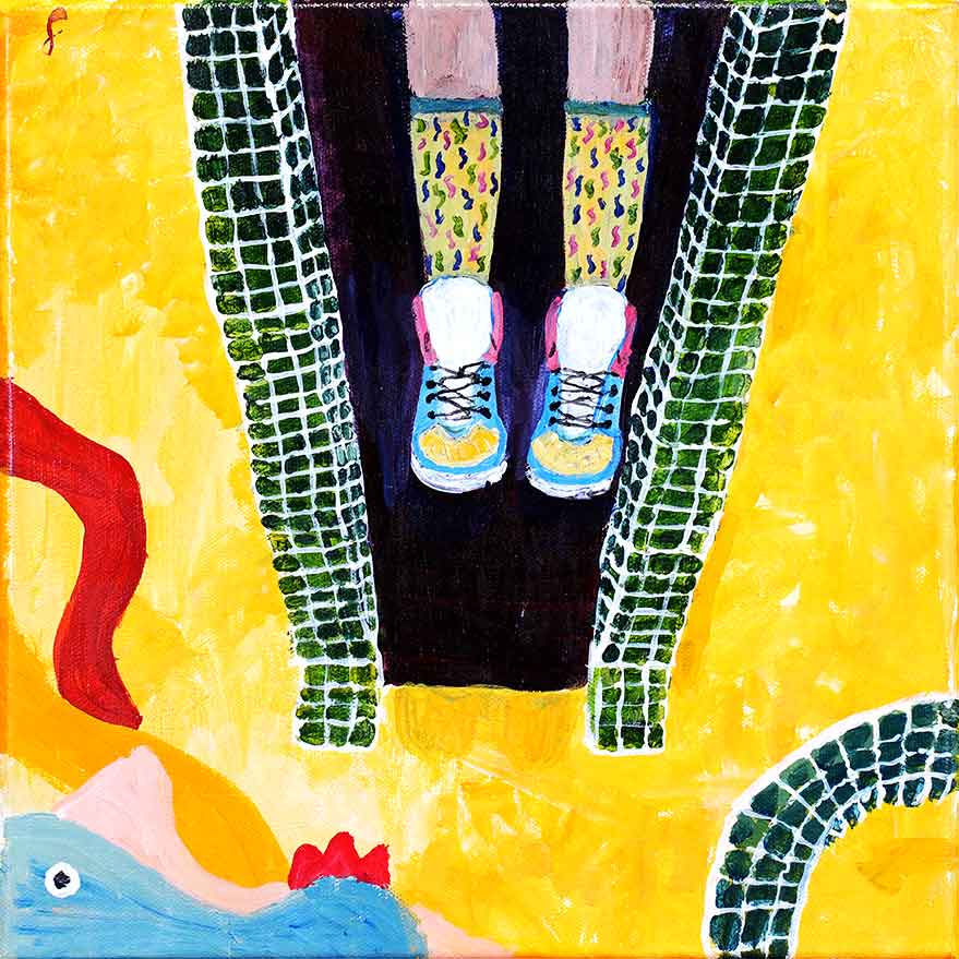 This artwork is a joyful glance at childhood wonder, feet poised mid-play, surrounded by bright colours and patterns. The bold colours dance like laughter, while tiled textures hint at familiar playgrounds and shared memories. It celebrates the simple magic of being young, not in age, but in spirit. A reminder that in every step, especially together, we find a place where joy lives on and the child in us is never forgotten.