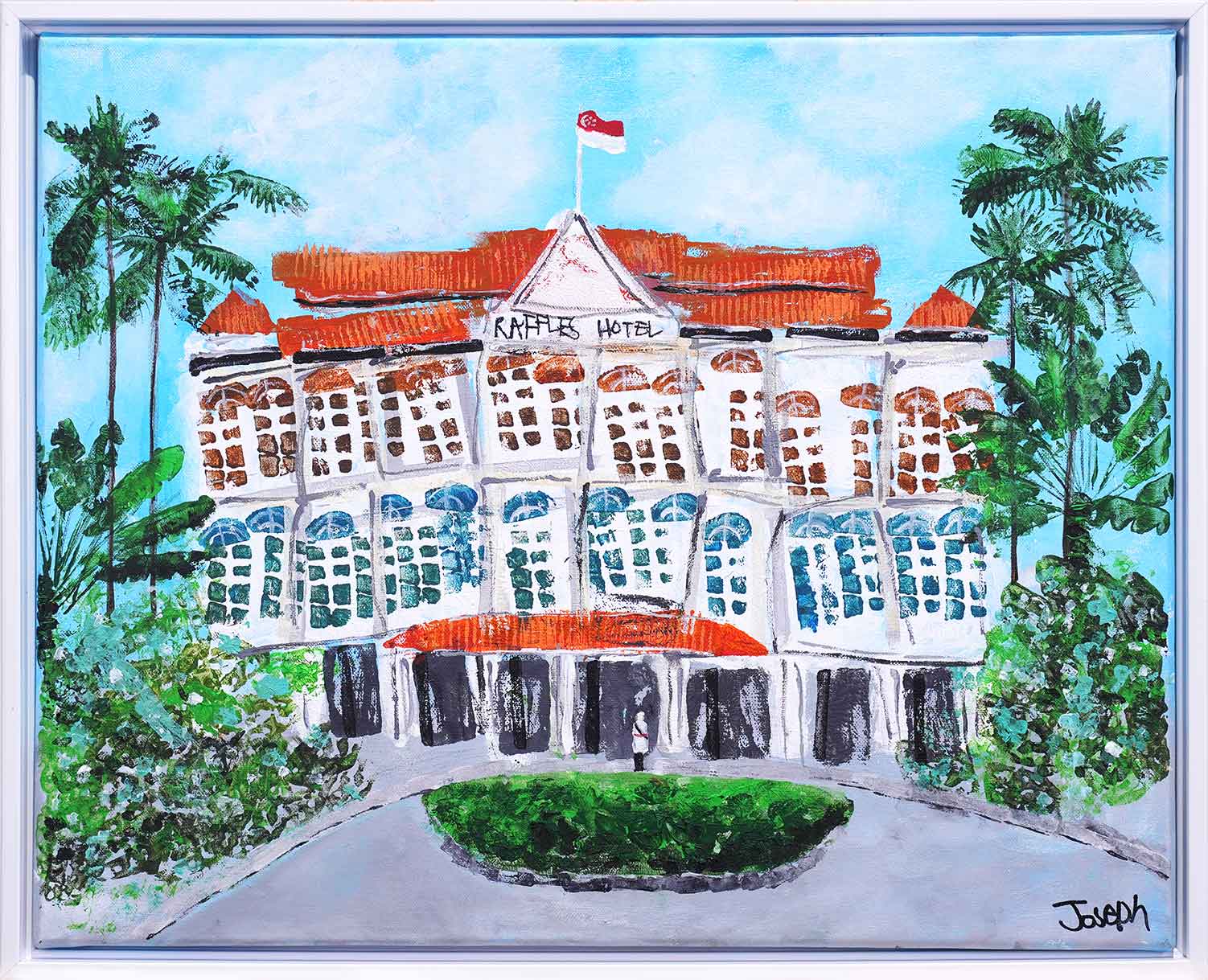 The iconic Raffles Hotel in Singapore, a colonial-era landmark rich in history. With printmaking techniques, Joseph wanted to bring out the hotel's distinctive period architecture, known for its grand facades, arched windows, and enduring charm. The textured impressions in this artwork highlight both the structured beauty and the flow of time, preserving a sense of nostalgia while recognising its lasting significance.
