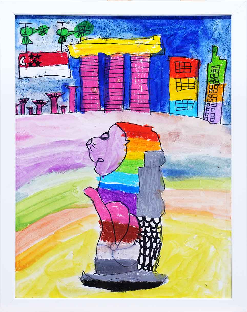 "Rainbow Merlion" is a vibrant celebration of Singapore’s unity and progress. The iconic Merlion, rendered in rainbow colours, symbolises the nation’s diversity and inclusivity. In the background, Singapore’s skyline, with Marina Bay Sands towering above, reflects the city’s growth and modernity. The scene captures a moment of national pride, with helicopters carrying the Singapore flag through the sky with honour and purpose. This depiction reflects not only the nation’s resilience and achievements but also its collective spirit, where every colour, every detail, comes together to form a unified whole.