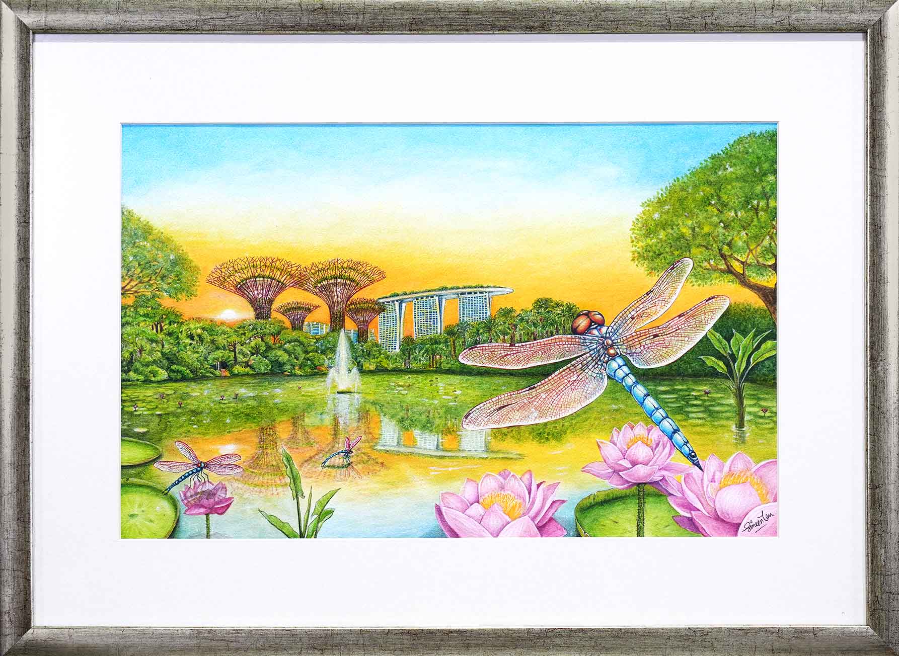 This painting captures the iconic Gardens by the Bay in the stillness of dawn. Bathed in soft morning light, the lush greenery reflects Singapore’s vision of harmony between nature and urban living. The quiet serenity of the scene evokes calm and contemplation, echoing the nation’s identity as a Garden City. A dragonfly glides gracefully over a lily pond, symbolising the delicate balance between the natural world and modern progress. Its presence adds a poetic touch to this tribute. This tranquil landscape stands as a celebration of Singapore’s spirit: forward-looking yet rooted in care for the environment. A heartfelt homage to its natural beauty for future generations. Happy SG60, Singapore!