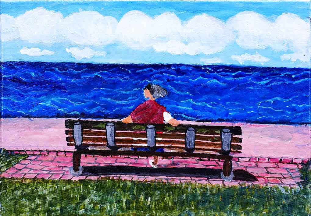 As the waves roll in soft rhythm, mirroring breath, while clouds drift like slow-moving thoughts across the canvas of the day, a solitary figure sits quietly on a weathered bench, gazing out toward an endless blue. The red-brick path and green grass frame the scene with gentle grounding, yet all attention draws toward the vastness ahead. This is where peace comes, not in silence, but in the soft chorus of wind, water, and the weightless passing of time, in the nature of it all.