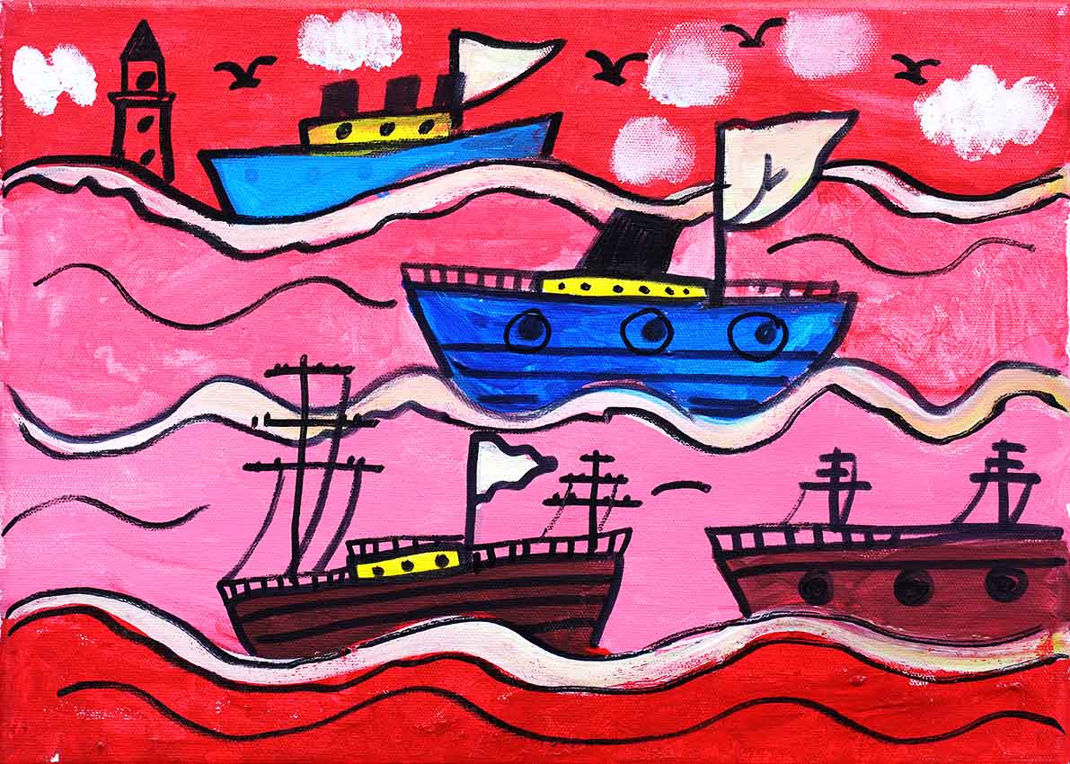 Singapore Harbour captures the vibrant energy and movement of a bustling port, with ships navigating through stylised, colourful waves. Set against a bold red sky, dotted with fluffy clouds and flying birds, the scene pulses with life. A lighthouse on the horizon offers a sense of direction and safety. This whimsical piece reflects the multicultural spirit of Singapore's maritime heritage, blending playful imagination with the dynamic essence of the busy harbour.
