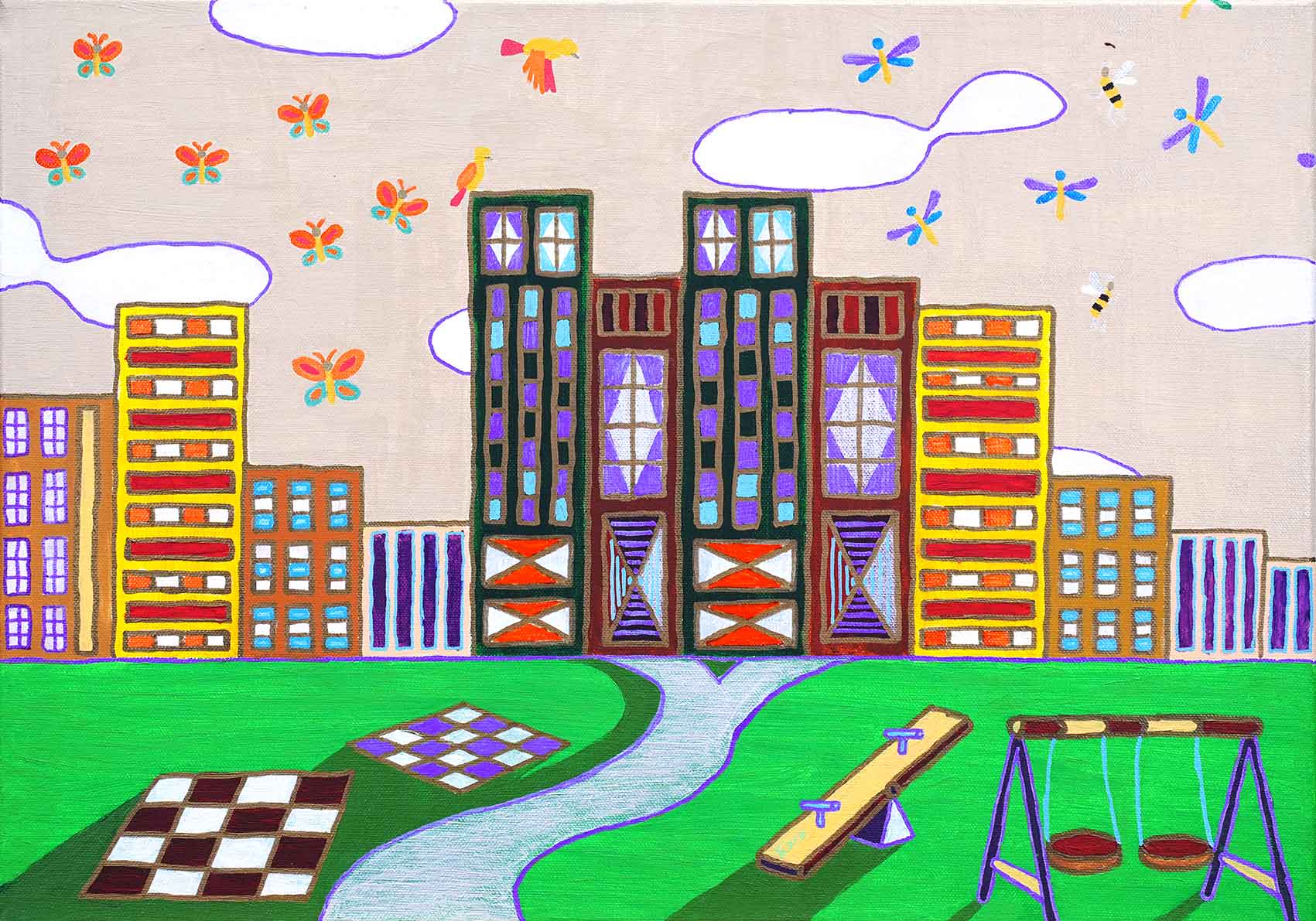 A celebration of Singapore’s 60-year journey, Gridline reflects the city’s transformation into a bold, structured yet vibrant metropolis. The geometric skyline symbolises progress and innovation, while the playground below highlights Singapore’s dedication to livability and community. Above, a sky filled with butterflies and bees represents the nation’s dynamic energy and harmony with nature. Gridline captures the balance between order and creativity, past and future, just like Singapore itself.