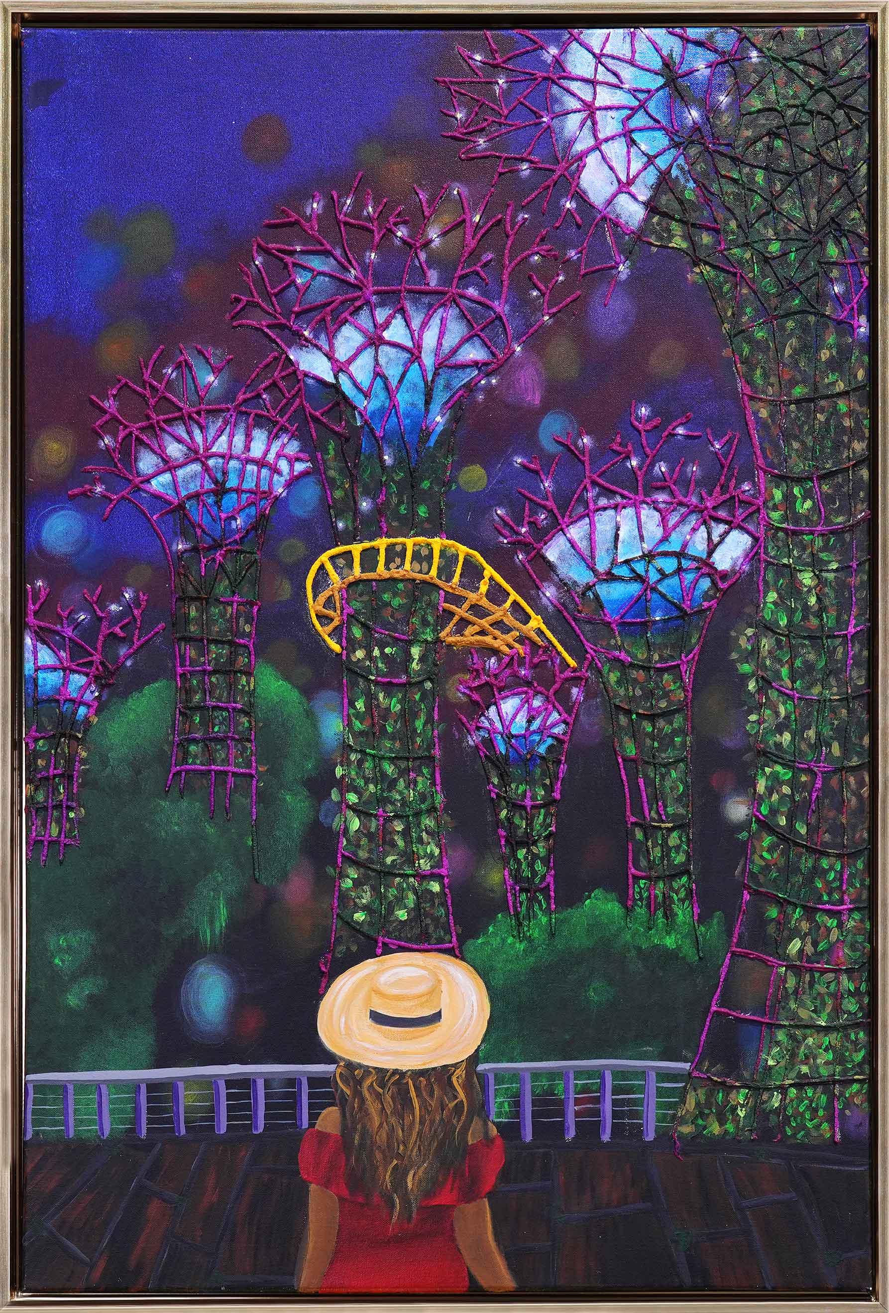 At night, Singapore’s iconic Gardens by the Bay is bathed in the soft glow of the Supertrees. The dazzling lights evoke a sense of wonder, casting a dreamlike atmosphere over the gardens as the Supertrees come alive. The textured elements bring depth and vibrancy, celebrating the perfect harmony between nature and futuristic design that defines this beloved landmark.