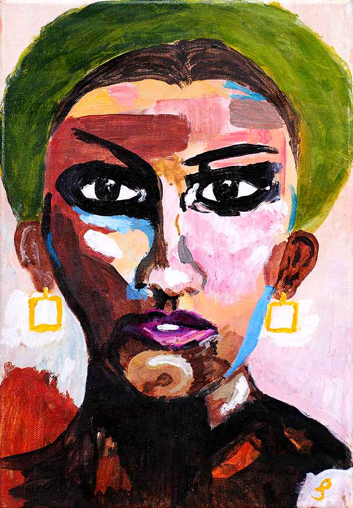 In this artwork, the face is a canvas for contrast: sharp strokes of shadow and light collide across cheekbones, lips, and brow, creating a portrait not of perfection, but of power. The green headwrap, a crown for her presence, the gold earrings catching the light like declarations. The gaze is fierce, eyes lined in defiance and clarity, as if she knows exactly who she is, and dares the world to question it. Every brushstroke is deliberate, each colour clash intentional, because this is not about blending in. It’s about taking up space, owning it, and working it without hesitation.