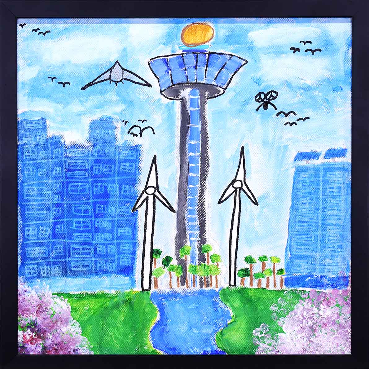 This artwork reimagines Singapore’s iconic Changi Airport as a beacon of sustainability. At its heart, the renowned control tower rises amid the lush greenery, eco-friendly buildings, and elegant wind turbines. The scene emphasises Singapore’s unwavering commitment to green innovation in aviation, merging technological advancement with environmental stewardship to shape a cleaner, more sustainable future for air travel.