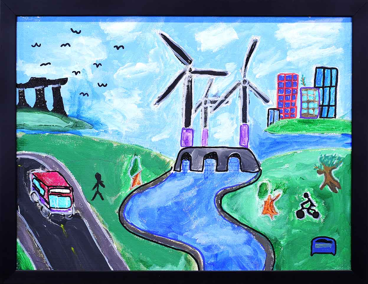 “Sustainable Cityscape” envisions a future where renewable energy breathes life into the city. Wind turbines rise above a flowing river, symbolising the power of clean energy. Sustainable transportation, such as buses and bicycles, encourages eco-friendly mobility. Through this artwork, the integration of green energy, sustainable transport, and environmental conservation comes together, inspiring a cleaner, greener future for all.