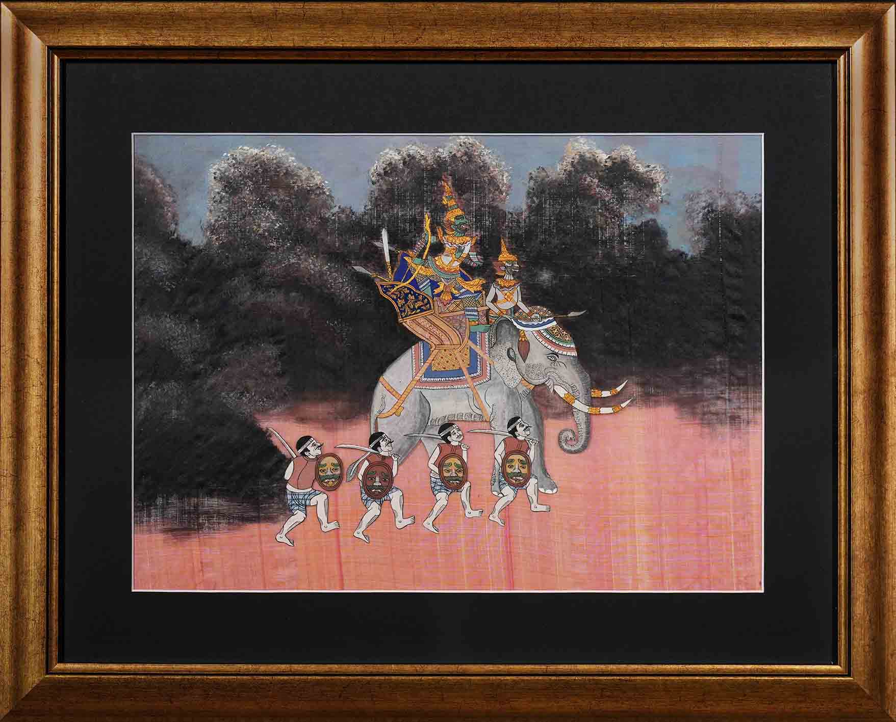 This painting celebrates the influence of Angkor-era art and the Ramayana on Cambodian culture. It depicts Indra on his celestial elephant Airavata, accompanied by soldiers ready for battle. The artwork blends classical iconography with Khmer reverence for divine authority, drawing on imagery from Angkor Wat’s Ramayana galleries. It connects Cambodia’s cultural heritage with the enduring legacy of the Khmer Empire and Hindu mythology.