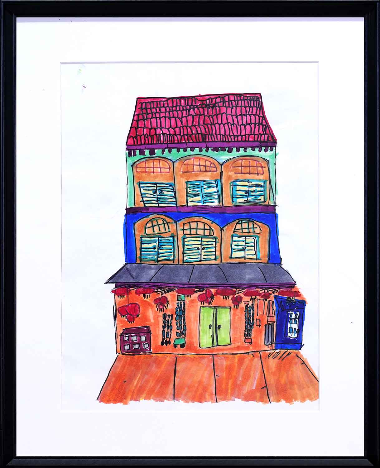 Arshan’s painting of a Chinese shophouse is bathed in warm, earthy tones, with flashes of orange, green and blue that evoke both a nostalgic and modern-day feel. Through this artwork, Arshan hopes to tell the history of Singapore's Chinatown, from the struggles of the early settlers to the vibrant, multicultural hub it has become today. His work captures the essence of Chinatown as a living, breathing story — its layers of history, culture, and the spirit of the community that has shaped it.