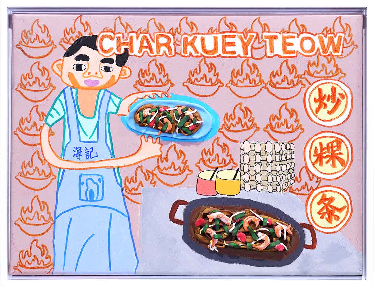This artwork celebrates Singapore’s beloved Char Kuey Teow, capturing the essence of the country’s vibrant hawker culture. Featuring a passionate hawker stall owner proudly presenting his wok-fried dish, his dedication shines through in every detail. The warm, fiery background symbolises the intense heat and skill required to perfect this iconic dish, reflecting the energy and expertise behind every plate.