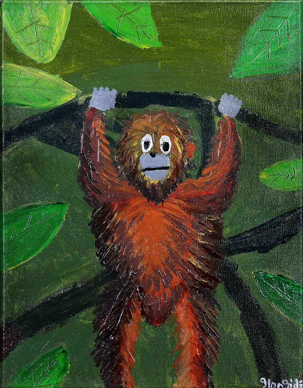 The artist painted this monkey in a moment of stillness – resting on a tree branch, his expression calm and content. He looks innocent and happy at first, but there is more beneath the surface. Behind those quiet eyes is a mind filled with questions. He wonders how leaves grow, why the wind sounds different in the morning, and what lies beyond the tallest tree. The artist sometimes feels that way too. He appears quiet while his mind is filled with ideas and questions. This painting is a reflection of that quiet wonder, being composed on the outside, but filled with curiosity inside.