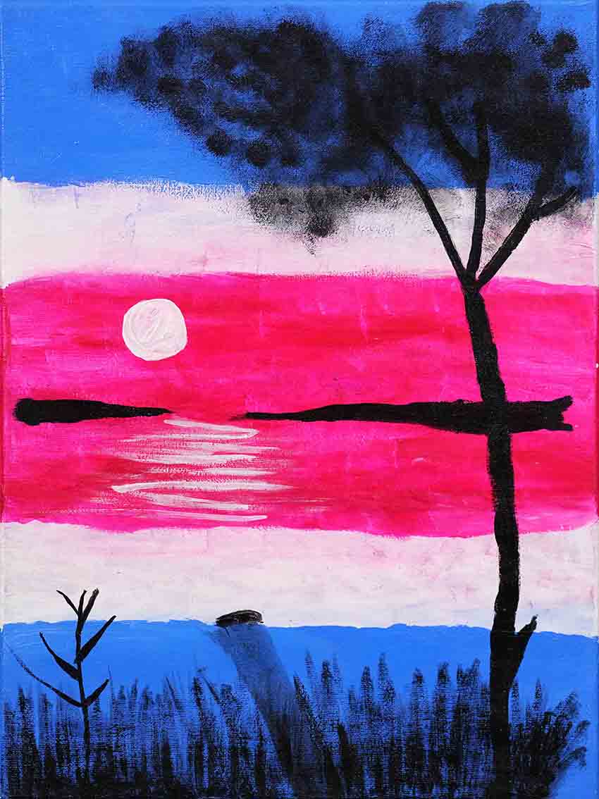 "Tropical Oasis" captures the serene transition of day to night in a tropical landscape, featuring a glowing sun setting over calm waters with vibrant reds, pinks, and blues reflected beneath silhouetted trees and grasses. Hikmah created a gradient background blending warm and cool tones to evoke warmth and tranquility, while dark silhouettes add depth and contrast. Gentle strokes suggest rippling water, and stippling depicts dense foliage, together symbolising peace and reflection. This vivid scene invites viewers to escape into a harmonious, secluded paradise where nature’s quiet beauty takes centre stage.