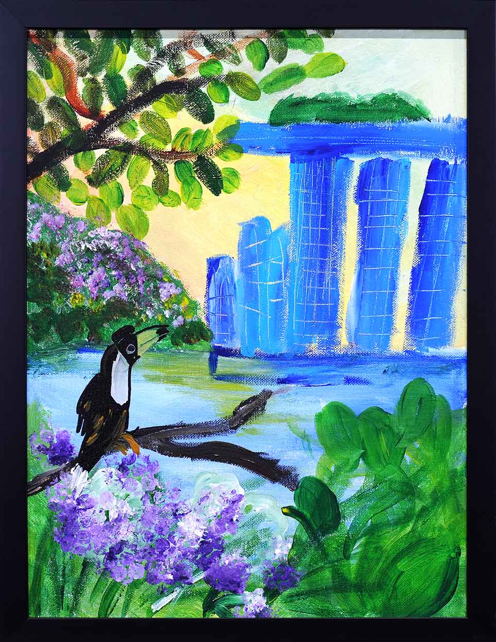 “Urban Oasis” captures the seamless coexistence of nature and modern architecture in Singapore, where lush flora and fauna intertwine with cutting-edge structures. The scene reflects Singapore’s enduring commitment to integrating nature with its urban landscape, remaining steadfast in its identity as a garden city, where green and growth flourish amidst the city fabric.