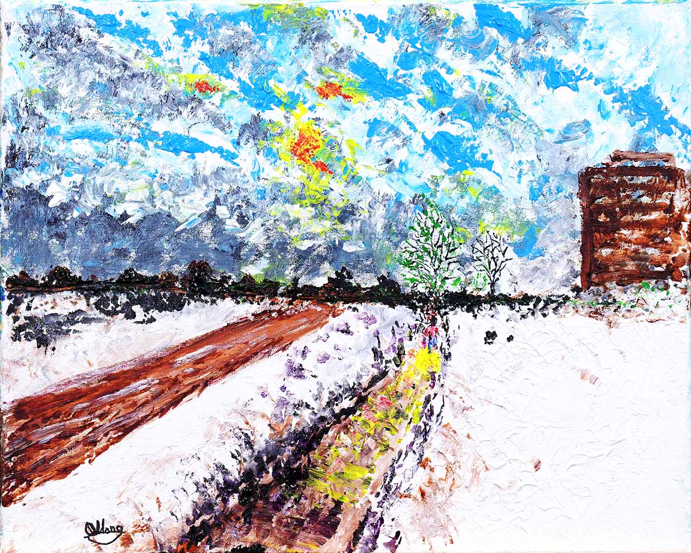 Inspired by a friend’s story of a journey through a snow-covered landscape, Mr Ong depicts a small figure walking home through the vast, calm snow. This evokes a sense of quiet reflection and peaceful solitude, contrasting the figure and the wide winter surroundings.
