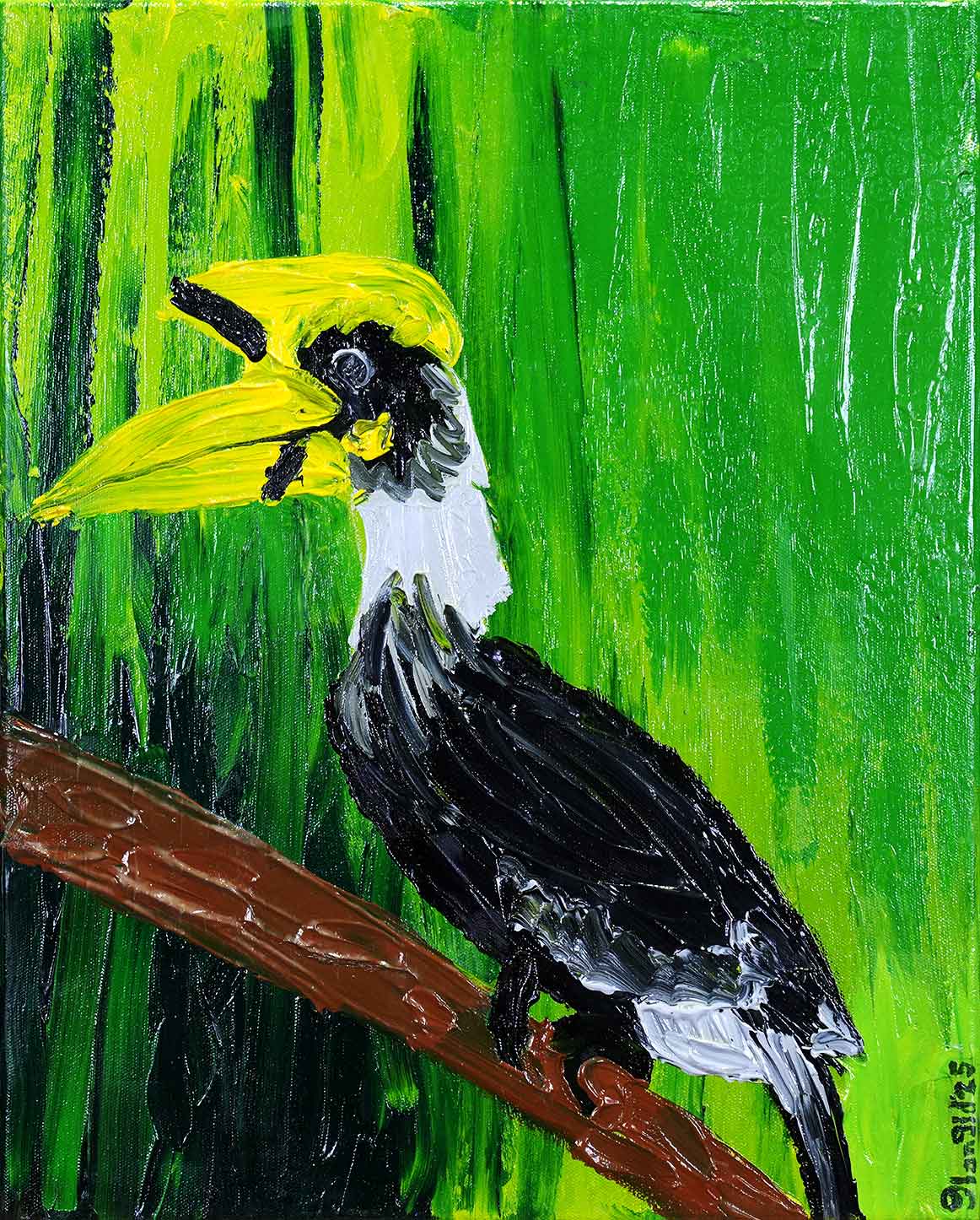The artist once saw a hornbill at the zoo and couldn’t take his eyes off its beak — bright and golden like a splash of sunshine. The artist painted the hornbill's body black and white because that's what it really looks like, but the background — lush with greens and hints of gold — is the jungle as the artist imagines it: vibrant, quiet, and full of mystery. The bird looks quiet, but if you linger with the painting, you might sense it singing. Not with sound, but with presence — soft and steady, like a melody only the heart can hear. The artist is drawn to animals — those that feel a little different, but filled with something unique.