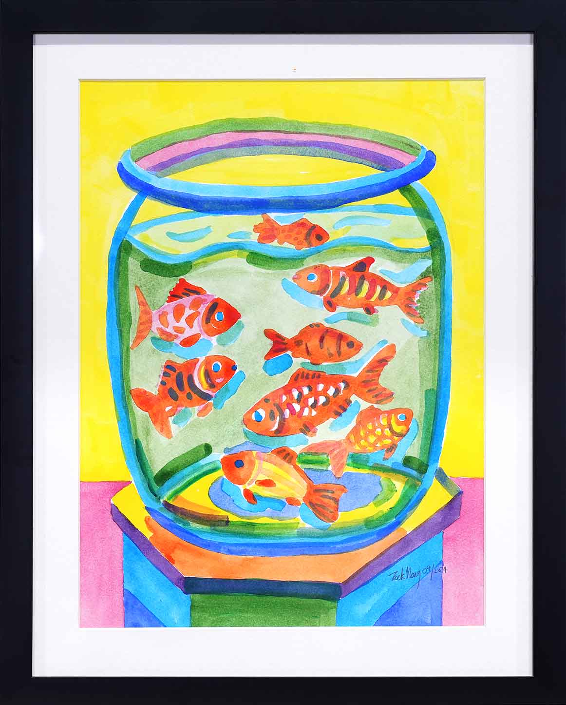 我常常看着鱼缸发呆。那些鱼儿在水中自由穿梭,游来游去,好像我们在童年的时光里——无忧无虑,充满好奇。这幅画里的金鱼色彩斑斓,围绕着绿色的水草和缤纷的石子,仿佛在跳舞。它们的世界虽然只是一个小小的鱼缸,但是充满了童年的梦想与幻想。就像我们小时候的心,小小的,却能装下整片天空。鱼缸之外,是我们成长的世界;在鱼缸之中,是我们回不去的童年。这幅作品提醒我们:虽然长大了,但是我们内心里依然收藏着曾经在那个水里自由游动、眼中充满光的童年自己。